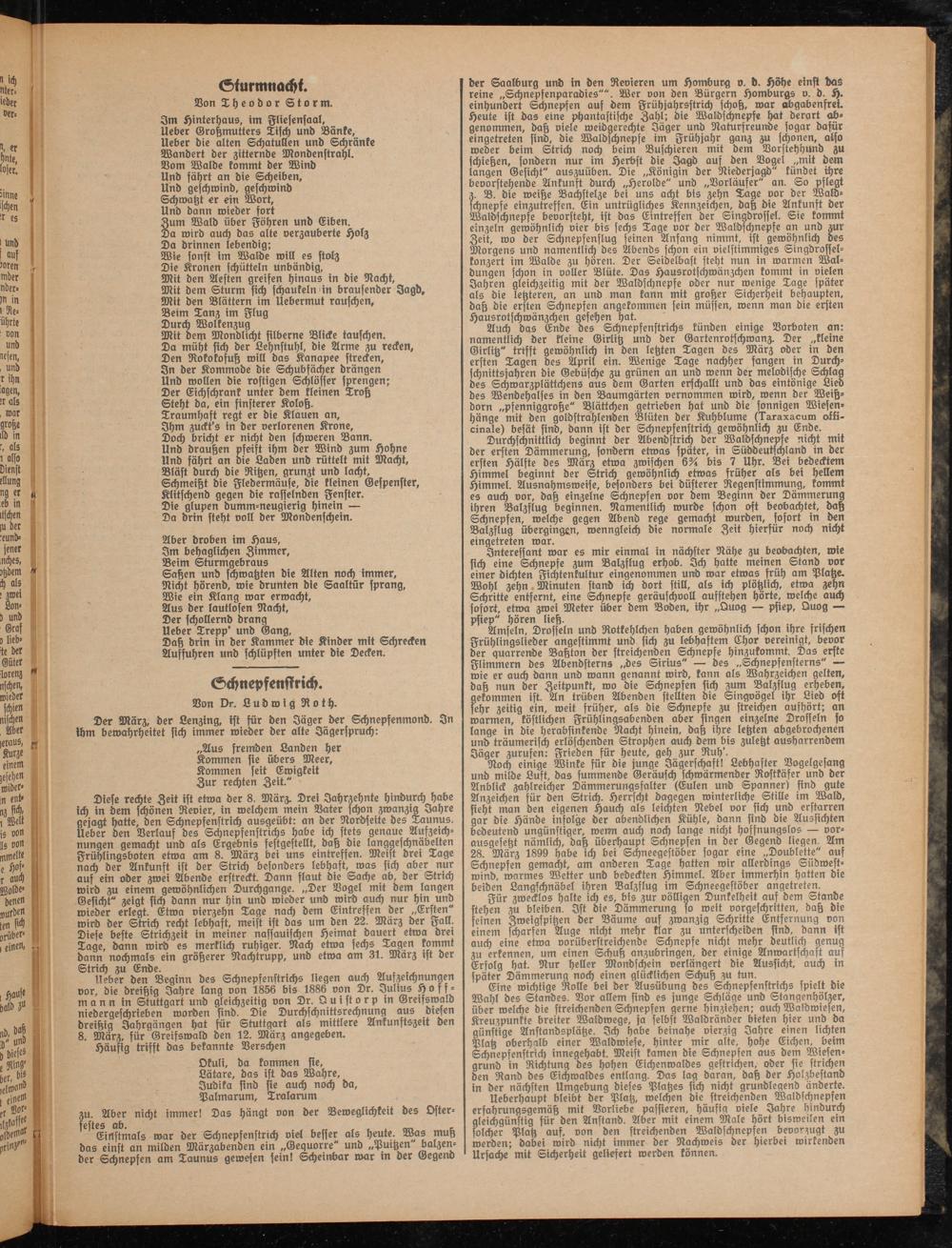 Amseln, Drosseln und Rotkehlchen haben gewöhnlich schon ihre frischen Frühlingslieder angestimmt und sich zu lebhaftem Chor vereinigt, bevor der quarrende Baßton der streichenden Schnepfe hinzukommt. Das erste Flimmern des Abendsterns „des Sirius" — des „Schnepfensterns" — wie er auch dann und wann genannt wird, kann als Wahrzeichen gelten, daß nun der Zeitpunkt, wo die Schnepfen sich zum Balzflug erheben, K* immen ist. An trüben Abenden stellten die Singvögel ihr Lied oft zeitig ein, weit früher, als die Schnepfe zu streichen aufhört; an warmen, köstlichen Frühlingsabenden aber fingen einzelne Drosseln so lange in die herabsinkende Nacht hinein, daß ihre letzten abgebrochenen und träumerisch erlöschenden Strophen auch dem bis zuletzt ausharrendem Jäger zurufen: Frieden für heute, geh zur Ruh'.