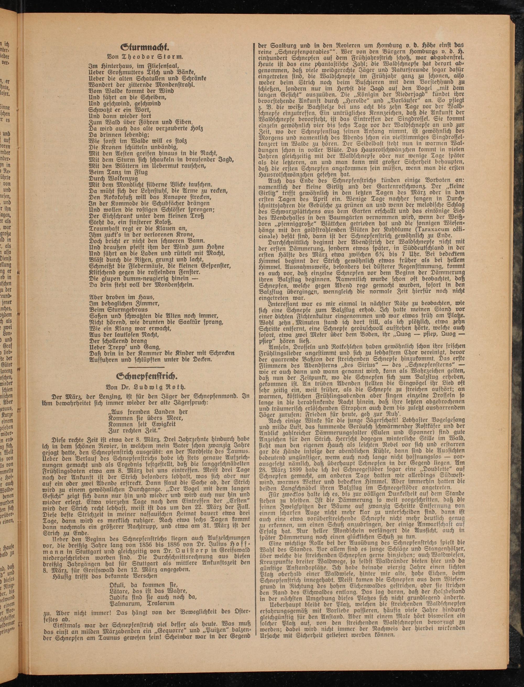 lieber den Beginn des Schnepfenstrichs liegen auch Aufzeichnungen vor, die dreißig Jahre lang von 1856 bis 1886 von Dr. Julius Hoffmann in Stuttgart und gleichzeitig von Dr. Q u istorp in Greifswald niedergeschrieben worden sind. Die Durchschnittsrechnung aus diesen dreißig Jahrgängen hat für Stuttgart als mittlere Ankunftszeit den 8. März, für'Greifswald den 12. März angegeben.