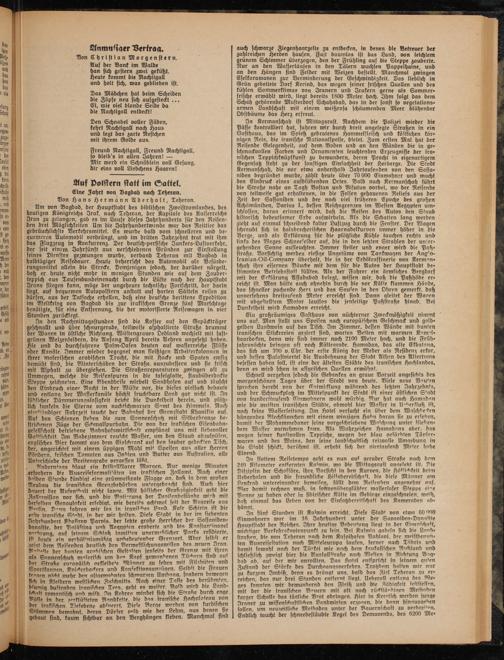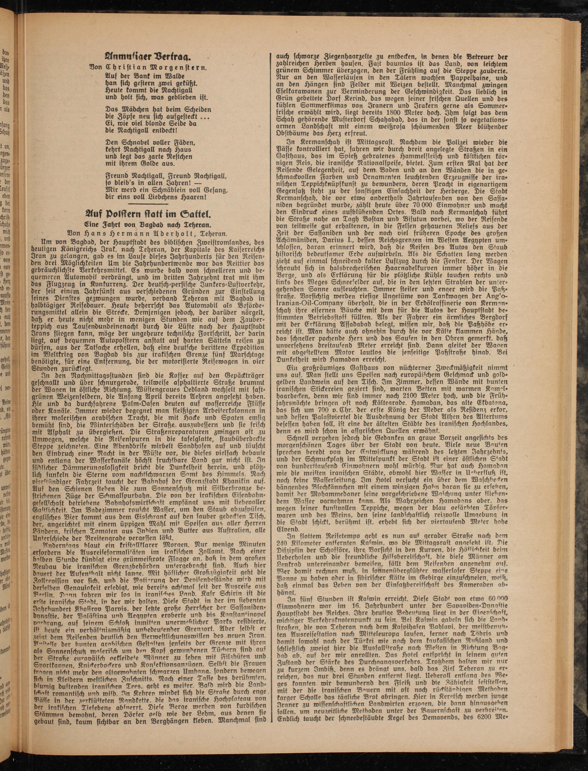 Um von Bagdad, der Hauptstadt des biblischen Zweistromlandes, des heutigen Königreichs Irak, nach Teheran, der Kapitale des Kaiserreichs Iran zu gelangen, gab es im Laufe dieses Jahrhunderts für den Reisenden drei Möglichkeiten Um die Jahrhundertwende war das Reittier das gebräuchlichste Verkehrsmittel. Es wurde bald vom schnelleren und bequemeren Automobil verdrängt, und im dritten Jahrzehnt trat mit ihm das Flugzeug in Konkurrenz. Der deutsch-persische Junkers-Lustverkehr, der seit einem Jahrfünft aus verschiedenen Gründen zur Einstellung seines Dienstes gezwungen wurde, verband Teheran mit Bagdad in halbtägiger Reisedauer. Heute beherrscht das Automobil als Beförderungsmittel allein die Strecke. Demjenigen jedoch, der darüber nörgelt, daß er heute nicht mehr in wenigen Stunden wie auf dem Zauberteppich aus Tausendundeinenacht durch die Lüfte nach der Hauptstadt Irans fliegen kann, möge der ungeheure technische Fortschritt, der darin liegt, auf bequemen Autopolstern anstatt auf harten Sätteln reifen zu dürfen, aus der Tatsache erhellen, daß eine deutsche berittene Expedition im Weltkrieg von Bagdad bis zur irakischen Grenze fünf Marschtage benötigte, für eine Entfernung, die der motorisierte Reisewagen in vier Stunden zurücklegt.