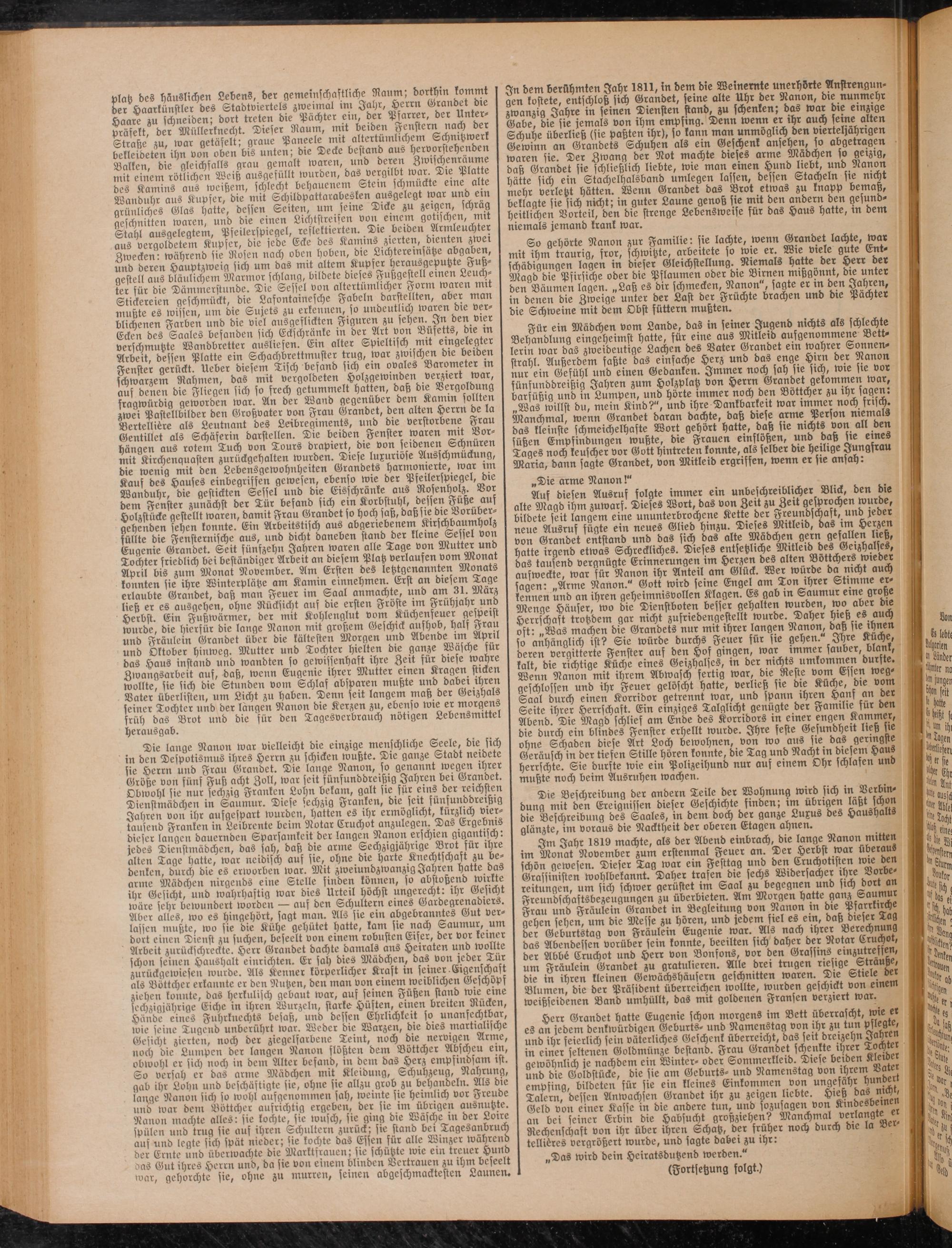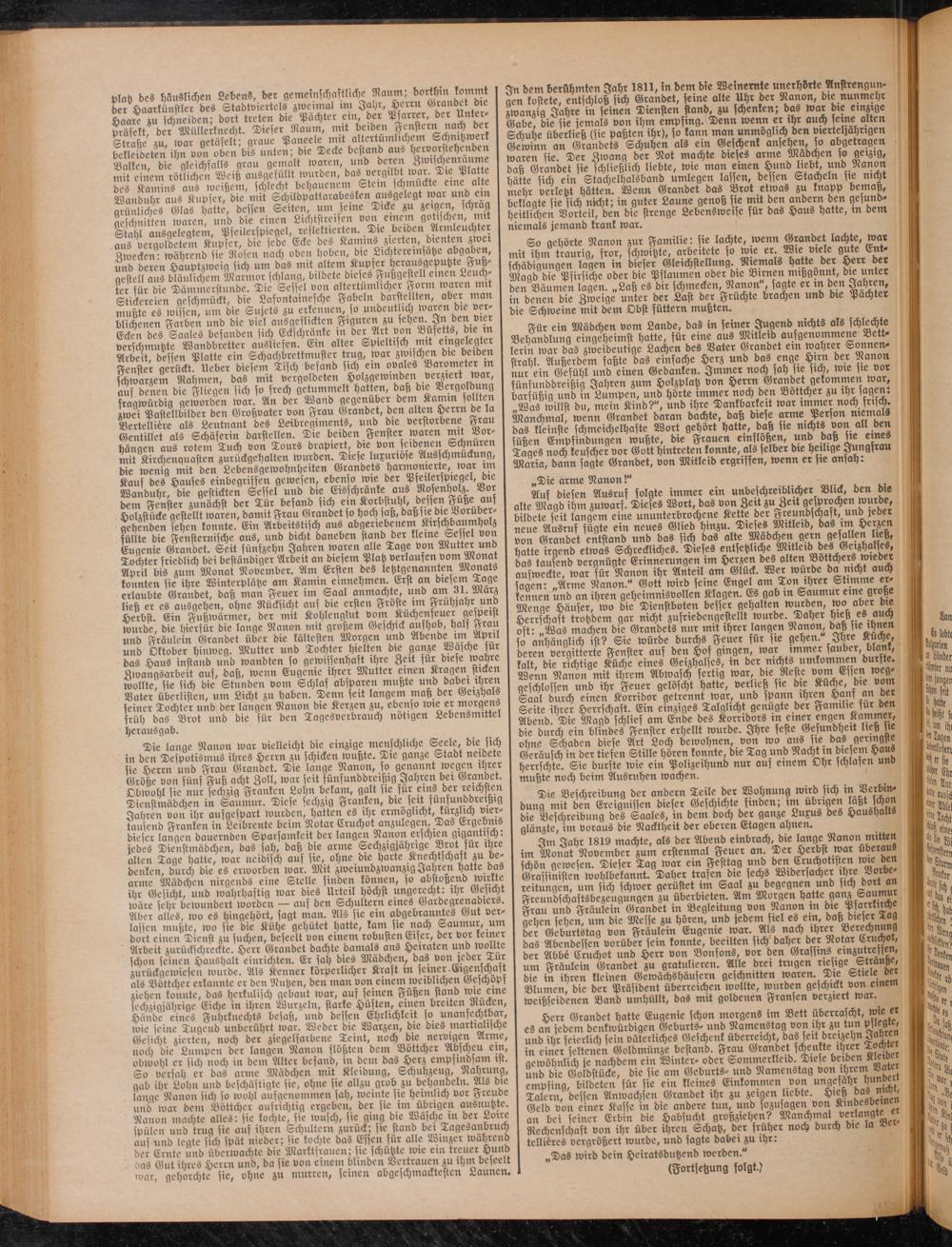 Die lange Nanon war vielleicht die einzige menschliche Seele, die sich in den De potismus ihres Herrn zu schicken wußte. Die ganze Stadt nerdete sie Herrn und Frau Gründet. Die lange Nanon, so genannt wegen ihrer Größe von fünf Fuß acht Zoll, war feit fünfunddrerßrg Jahren bet Gründet. Obwohl sie nur sechzig Franken Lohn bekam, galt srefür ems der reichsten I Dienstmädchen in Saumur. Diese sechzig Franken, die sert fünfunddrerßrg Jahren von ihr aufgespart wurden, hatten es ihr ermöglicht, kürzlich viertausend Franken in Leibrente beim Notar Cruchot anzulegen. Das Ergebms dieser langen dauernden Sparsamkeit der langen Nanon erschien gigantisch, jedes Dienstmädchen, das sah, daß die arme Sechziglährrge Brot für ihre alten Tage hatte, war neidisch aus sie, ohne die harte Knechtschaft zu bedenken, durch die es erworben war. Mit zweiundzwanzig Jahren hatte das arme Mädchen nirgends eine Stelle finden können, so abstoßend ünrlte ihr Gesicht, und wahrhaftig war dies Urteil höchst ungerecht: ihr Gesicht wäre sehr bewundert worden — auf den Schultern eines Gardegrenadiers. Aber alles, wo es hingehört, fagt man. Alls fie ein abgebranntes Gut ver- lasfen mußte, wo fie die Kühe gehütet hatte, kam sie nach Saumur, um dort einen Dienst zu suchen, beseelt von einem robusten Eifer, der vor keiner Arbeit zurückschreckte. Herr Gründet dachte damals ans Heiraten und wollte schon seinen Haushalt einrichten. Er sah dies Mädchen, das von jeder Tur zurückgewiesen wurde. Als Kenner körperlicher Kraft m semer Eigenschaft als Böttcher erkannte er den Nutzen, den man von einem werblichen Geschöpf ziehen konnte, das herkulisch gebaut war, aus seinen Füßen stand wre erne sechzigjährige Eiche in ihren Wurzeln, starke Hüften, einen breiten Rucken, Hände eines Fuhrknechts besaß, und dessen Ehrlichkeit so unanfechtbar, wie seine Tugend unberührt war. Weder die Warzen, die dies martialische Gesicht zierten, noch der ziegelfarbene Teint, noch die nervigen Arme, noch die Lumpen der langen Nanon flößten dem Böttcher Abfcheu ein, obwohl er sich noch in dem Alter befand, in dem das Herz empfnwsam ist. So verfah er das arme Mädchen mit Kleidung, Schuhzeug, Nahrung, gab ihr Lohn und befchäftigte fie, ohne fie allzu grob zu behandeln. Als die lange Nanon sich so wohl aufgenommen sah, weinte sie heimlich vor Freude und war dem Böttcher aufrichtig ergeben, der fie im übrigen ausnutzte. Nanon machte alles: fie kochte, fie wusch, sie ging d,e Wäsche in der Lowe spülen und trug sie aus ihren Schiiltern zurück; sie stand bei Tagesanbruch auf und legte sich spät nieder; sie kochte das Essen für alle Winzer wahrend der Ernte und übertvachte die Marktfrauen; sie schützte rote em treuer Hund aas Gut ihres Herrn und, da sie von einem blinden Vertrauen zu ihm beseelt tunt, gehorchte sie, ohne zu murren, seinen ntigeschmaätesten ßnuncru