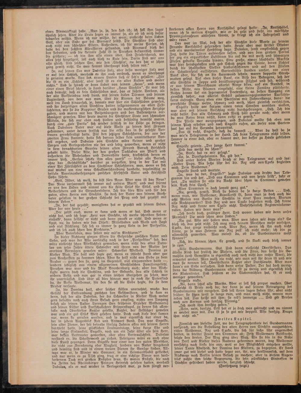 bedanken mühte. Wenn ich nur wüßte, bei wem; vielleicht beim lieben , Gott, oder am Ende gar bei Bismarck selbst. Die Stechlme sind aber auch nicht von schlechten Eltern. Außerdem, ich für meme Per on, ich habe bei den sechsten Kürassieren gestanden, und Bismarck bloß be, den siebenten, und die kleinere Zahl ,st tn Preußen bekanntlich immer die größere; — ich bin ihm also einen über. Und Friedrichsruh, wo alles jetzt hinpilgert, soll auch bloß ne Kate sein. Darm sind wir uns allo gleich. Und solchen See, wie den ,Stechlin, nu den hat er schon ganj gewiß nicht. So was kommt überhaupt bloß selten vor.