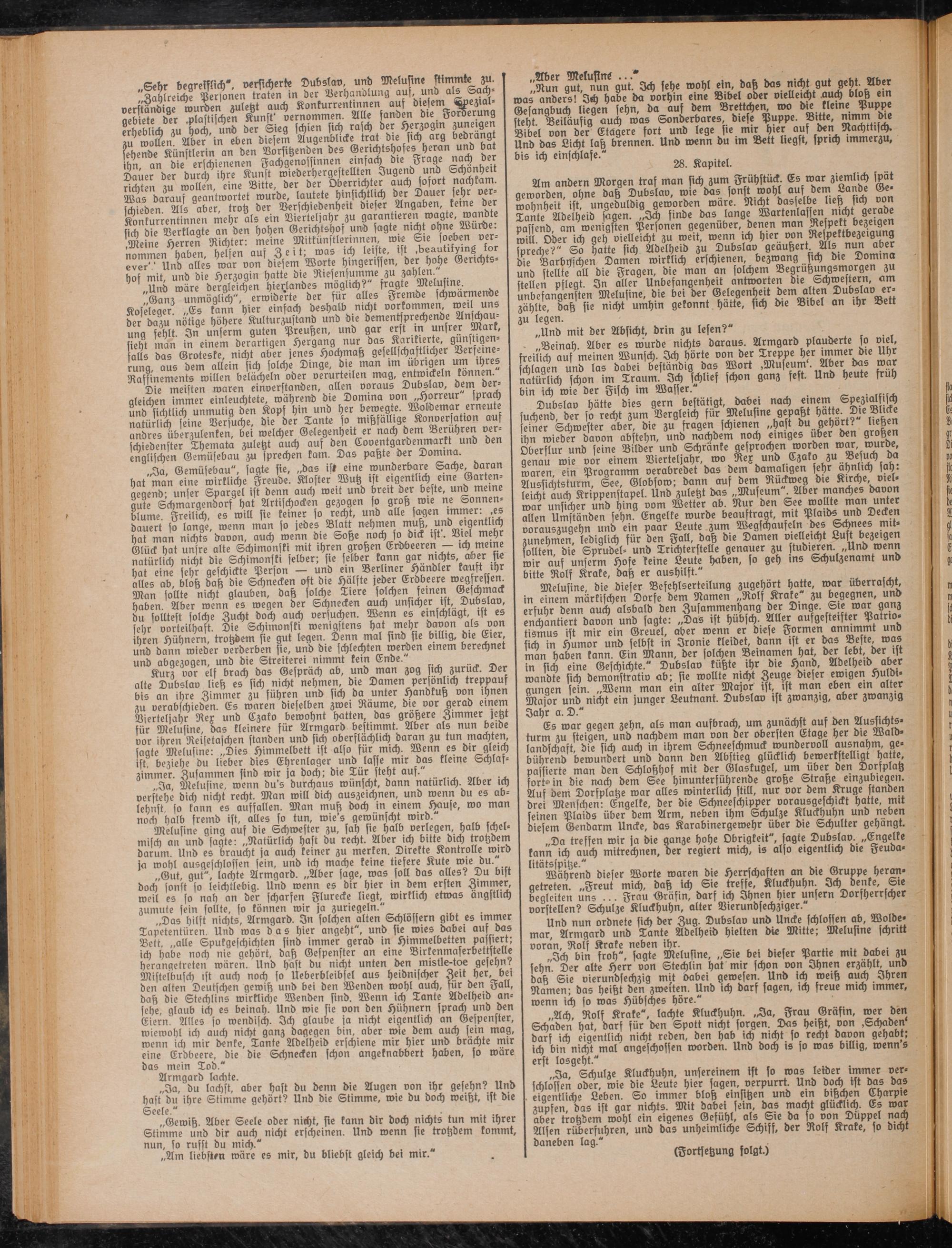 „Das hilft nichts, Armgard. In solchen alten Schlössern gibt es immer Tapetentüren. Und was das hier angeht", und sie wies dabei auf das Bett, „alle Spukgeschichten sind immer gerad in Himmelbetten passiert; ich habe noch nie gehört, daß Gespenster an eine Birkenmaserbettstelle herangetreten wären. Und hast du nicht unten den mistle-toe gesehn? Mistelbusch ist auch noch so Ueberbleibsel aus heidnischer Zeit her, bei den alten Deutschen gewiß und bei den Wenden wohl auch, für den Fall, daß die Stechlins wirkliche Wenden sind. Wenn ich Tante Adelheid ansehe, glaub ich es beinah. Und wie sie von den Hühnern sprach und den Eiern. Alles so wendisch. Ich glaube ja nicht eigentlich an Gespenster, wiewohl ich auch nicht ganz dagegen bin, aber wie dem auch sein mag, wenn ich mir denke, Tante Adelheid erschiene mir hier und brächte mir eine Erdbeere, die die Schnecken schon angetnabbert haben, fo wäre