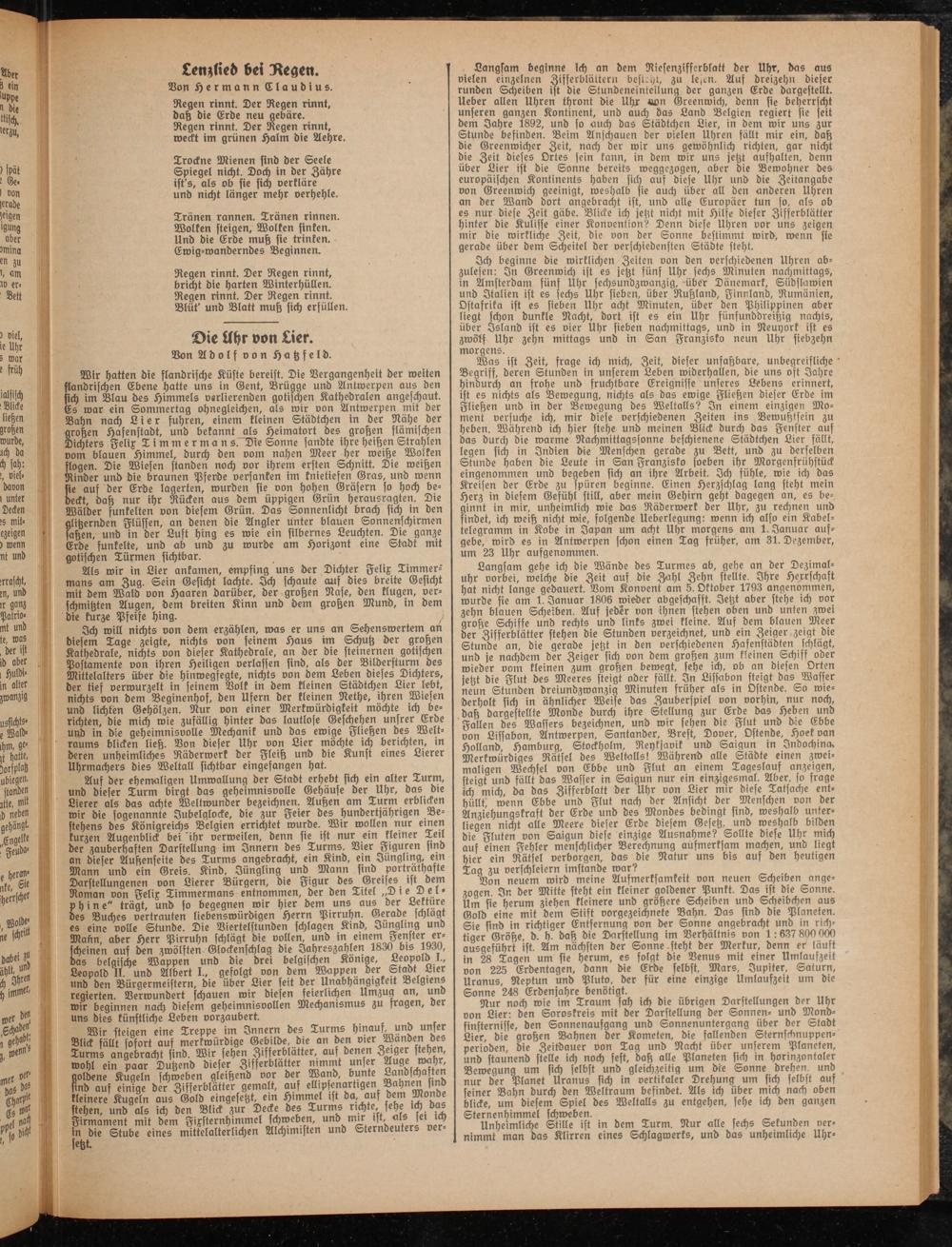 Ich will nichts von dem erzählen, was er uns an Sehenswertem an diesem Tage zeigte, nichts von seinem Haus im Schutz der großen Kathedrale, nichts von dieser Kathedrale, an der die steinernen gotischen Postamente von ihren Heiligen verlassen sind, als der Bildersturm des Mittelalters über die hinwegfegte, nichts von dem Leben dieses Dichters, der tief verwurzelt in feinem Volk in dem kleinen Städtchen Lier lebt, nichts von dem Beginenhof, den Ufern der kleinen Nethe, ihren Wiesen und lichten Gehölzen. Nur von einer Merkwürdigkeit möchte ich berichten, die mich wie zufällig hinter das lautlose Geschehen unsrer Erde und in die geheimnisvolle Mechanik und das ewige Fließen des Weltraums blicken ließ. Von dieser Uhr von Lier möchte ich berichten, in deren unheimliches Räderwerk der Fleiß und die Kunst eines Lierer Uhrmachers dies Weltall sichtbar eingefangen hat.