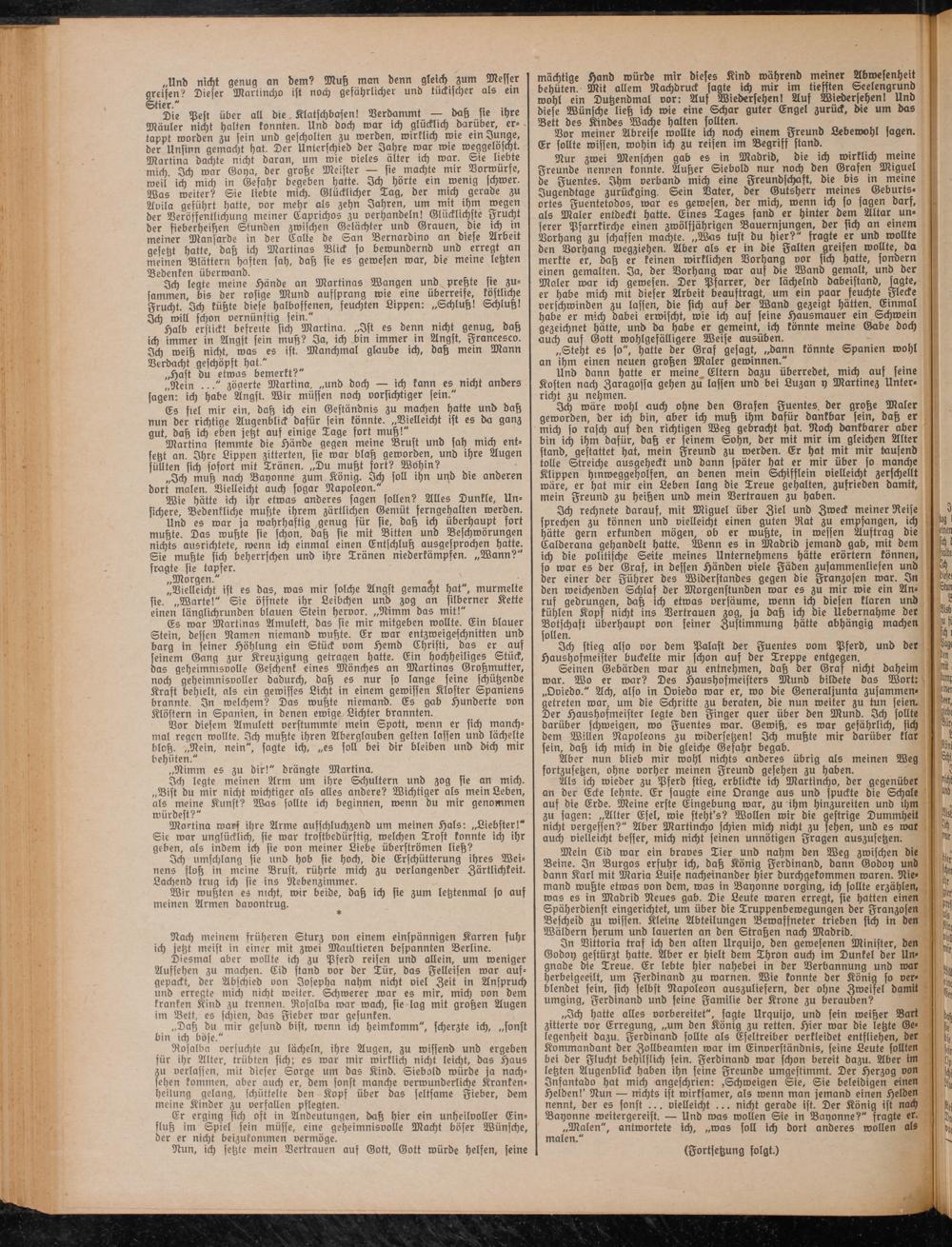 Ich wäre wohl auch ohne den Grasen Fuentes der große Maler geworden, der ich bin, aber ich muß ihm dafür dankbar sein, daß er mich so rasch auf den richtigen Weg gebracht hat. Noch dankbarer aber bin ich ihm dafür, daß er feinem Sohn, der mit mir im gleichen Alter stand, gestattet hat, mein Freund zu werden. Er hat mit mir tausend tolle Streiche ausgeheckt und bann später hat er mir über so manche Klippen hinweggeholfen, an benen mein Schifflein vielleicht zerschellt wäre, er hat mir ein Leben lang die Treue gehalten, zufrieden damit, mein Freund zu heißen und mein Vertrauen zu haben.