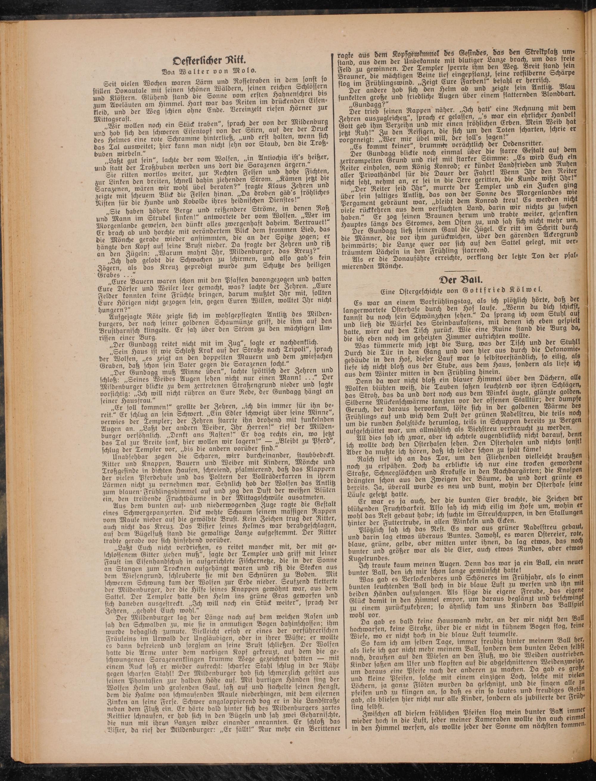 Der Gundagg ließ seinem Gaul die Zügel. Er ntt im Schritt durch bie Männer, bie vor ihm zurückwichen, über ben 9Qrenben Mdergrunb heimwärts; bie Lanze quer vor sich auf ben Sattel gelegt, mit ver 1 • ' Lächeln in ben Frühling starrend.
