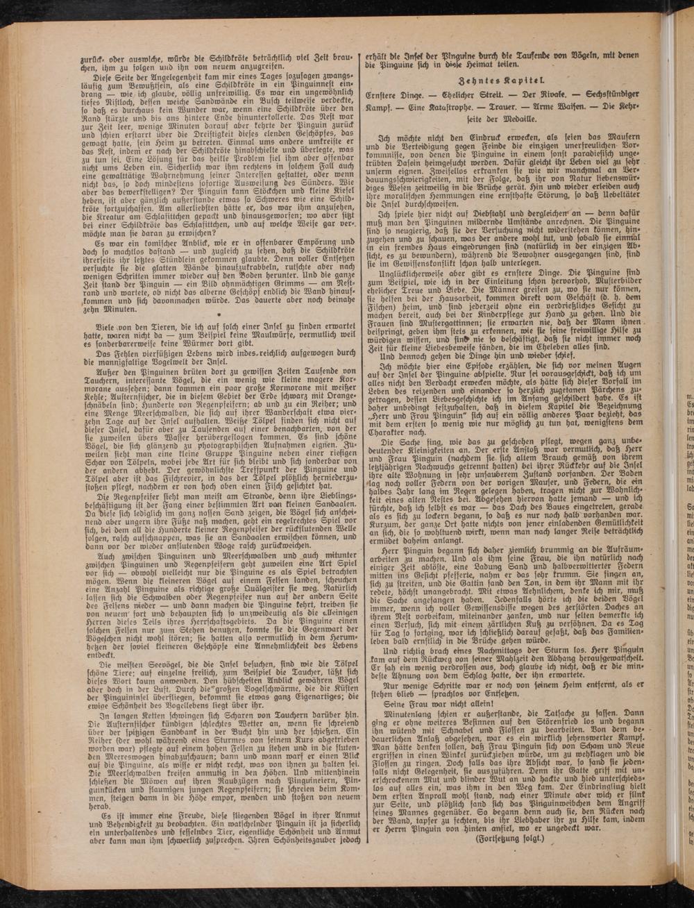 Ich mochte hier eine Episode erzählen, die sich vor meinen Augen auf der Insel der Pinguine abspielte. Nur sei vorausgeschickt, dah ich um alles nicht den Verdacht erwecken möchte, als hätte sich dieser Vorfall im Leben des reizenden und einander fo herzlich zugetanen Pärchens zu- getragen, dessen Webesgeschichte ich im Anfang geschildert habe. Cs ist daher unbedingt festzuhalten, dah in diesem Kapitel die Bezeichnung „Herr und Frau Pinguin" sich auf ein völlig anderes Paar bezieht, das mit dem ersten so wenig wie nur möglich zu tun hat, wenigstens dem Charakter nach.
