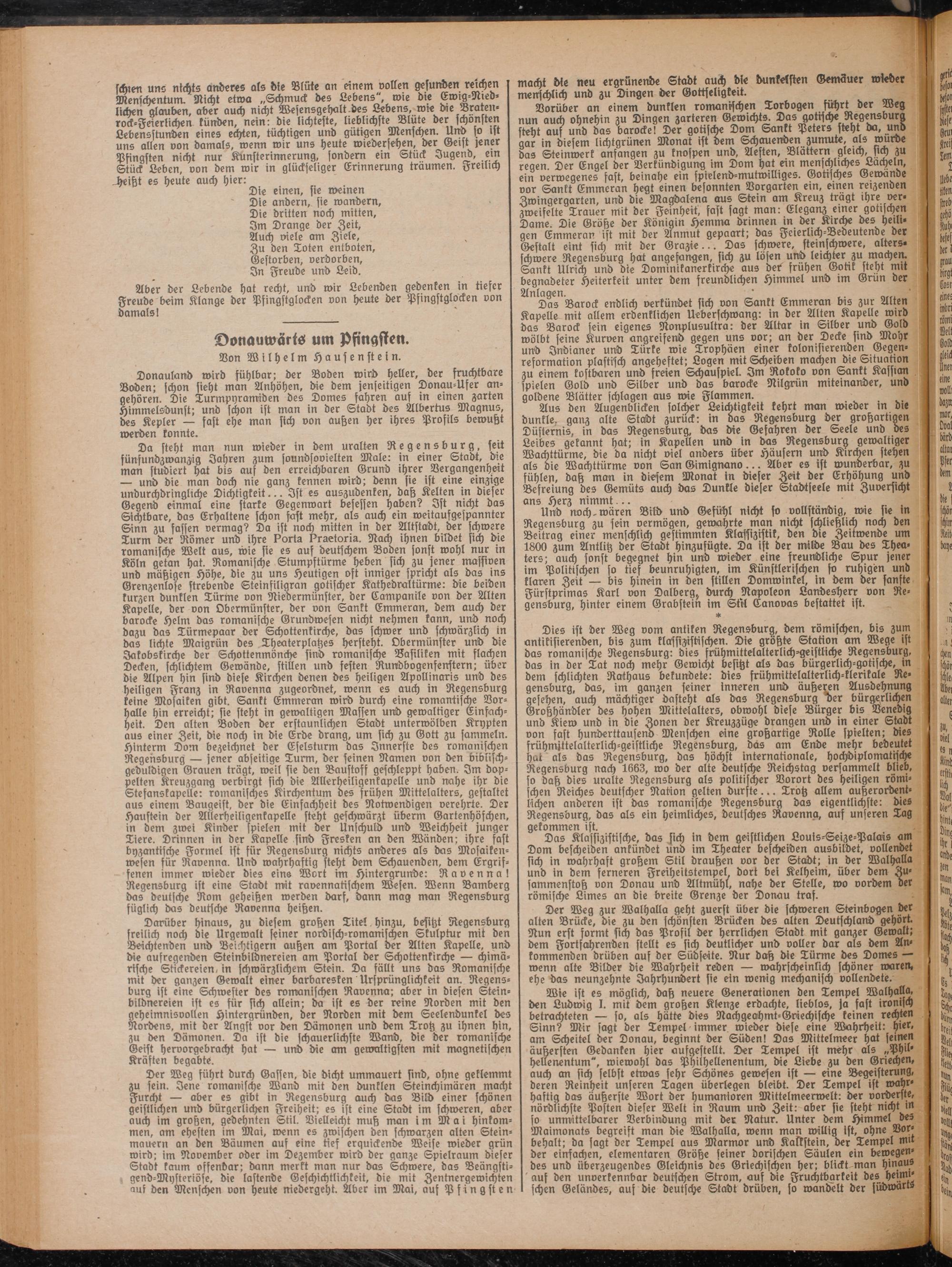 Dies ist der Weg vom antiken Regensburg, dem römischen, bis zum antikisierenden, bis zum klassizistischen. Die größte Station am Wege ist das romanische Regensburg: dies frühmittelalterlich-geistliche Regensburg, das in der Tat noch mehr Gewicht besitzt als das bürgerlich-gotische, in dem schlichten Rathaus bekundete: dies frühmittelalterlich-klerikale Regensburg, das, im ganzen feiner inneren und äußeren Ausdehnung gesehen, auch mächtiger dasteht als das Regensburg der bürgerlichen Großhändler des hohen Mittelalters, obwohl diese Bürger bis Venedig und Kiew und in die Zonen der Kreuzzüge drangen und in einer Stadt von fast hunderttausend Menschen eine großartige Rolle spielten; dies frühmjttelalterlich-geistliche Regensburg, das am Ende mehr bedeutet Hai als das Regensburg, das höchst internationale, hochdiplomatische Regensburg nach 1663, wo der alte deutsche Reichstag versammelt blieb, so daß dies uralte Regensburg als politischer Vorort des heiligen römischen Reiches deutscher Nation gelten durste... Trotz allem außerordentlichen anderen ist das romanische Regensburg das eigentlichste: dies Regensburg, das als ein heimliches, deutsches Ravenna, auf unseren Tag gekommen ist.