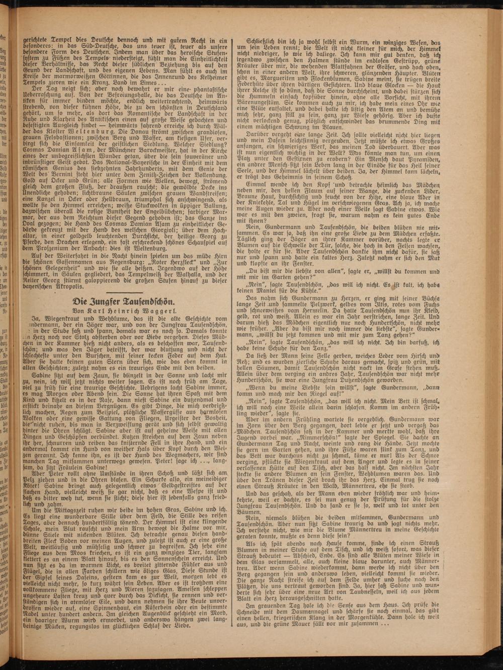 Aus ber Weiterfahrt in die Nacht hinein spielen um das müde Hirn die schönen Gassennamen aus Regensburg: „Roter Herzfleck" unb „Zur schönen Gelegenheit" unb wie sie alle heißen. Jrgenbwo auf der Höhe schimmert, in Säulen gegliedert, bas Tempelweitz ber Walhalla, und der Reiter Georg stürmt galoppierend die großen Stufen hinauf zu dieser bayerischen Akropolis.