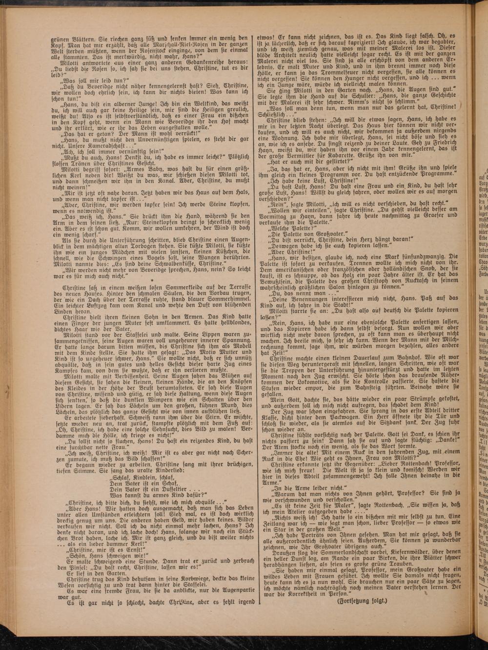 Er arbeitete fieberhaft. Schweiß rann ihm über die Stirn. Er wischte, setzte wieder neu an, trat zurück, stampfte plötzlich mit dem Fuß auf: „Oh, Christine, ich habe eine solche Sehnsucht, dies Bild zu malen! Verdamme mich die Hölle, ich kriege es nicht!"