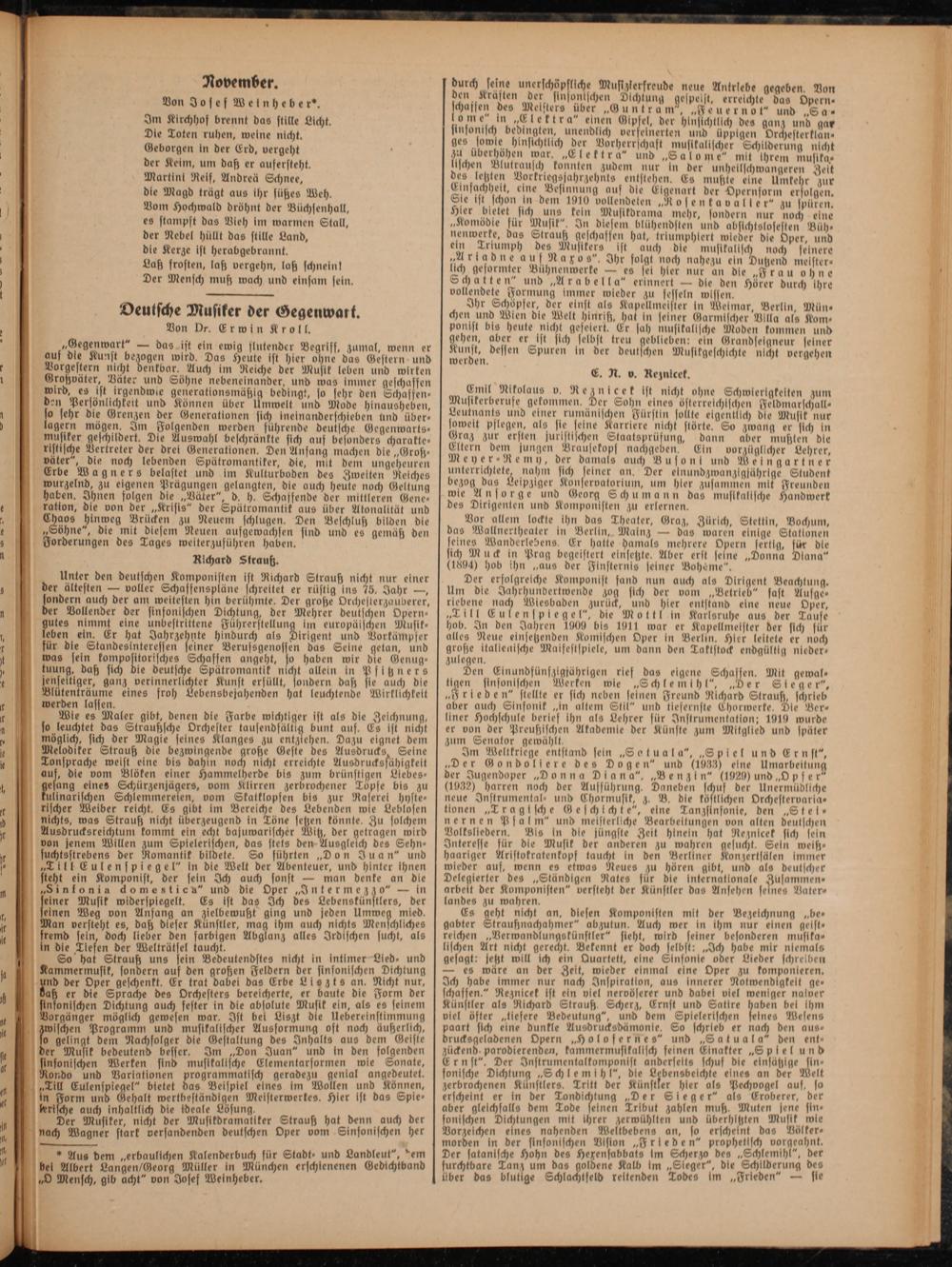 Es geht nicht an, diesen Komponisten mit der Bezeichnung „begabter Straußnachahmer" abzulun. Auch wer in ihm nur einen geistreichen „Verwandlungskünstler" sieht, wird seiner befonberen musikalischen Art nicht gerecht. Bekennt er doch selbst: ,Hch habe mir niemals gesagt: jetzt will ich ein Quartett, eine Sinfonie ober Lieder schreiben — es wäre an der Zeit, wieder einmal eine Oper zu komponieren. Ich habe immer nur nach Inspiration, aus innerer Notwendigkeit ge- schassen." Reznicek ist ein viel nervöserer und dabei viel weniger naiver Künstler als Richard Strauß. Scherz, Ernst unb Satire haben bei ihm viel öfter „tiefere 'Bedeutung", unb dem Spielerischen feines Wesens paart sich eine dunkle Ausdrucksdämonie. So schrieb er nach den ausdrucksgeladenen Opern „Holofernes" und „6 a f u a l er den entzückend parodierenden, kammermustkalifch feinen Einakter „Spiel und Ern ft". Der 3nffrumenta(tomponift anberfells schuf bie elnfätzige stn- onischo Dichtung „Schlemihl", die Lebensbeichte eines an der 'Welt zerbrochenen Künstlers. Tritt der Künstler hier als Pechvogel auf, so erscheint er in der Tondichtung „Der Sieger" als (Eroberer, der aber gleichfalls dem Tode feinen Tribut zahlen muß. Muten jene sin» onischen Dichtungen mit ihrer zerwühlten und überhitzten Musik wie Vorzeichen emes nahenden Westbebens an, fo erscheint das Völkermorden in der sinfonischen Vision „Frieden" prophetisch vorgeahnt. Der satanische Hohn des Hexensabbats im Scherzo des „Schlemihl", der urchtbare Tanz um das goldene Kalb im „Sieger", die Schilderung des über das blutige Schlachtseld reitenden Todes im „Frieden" — sie