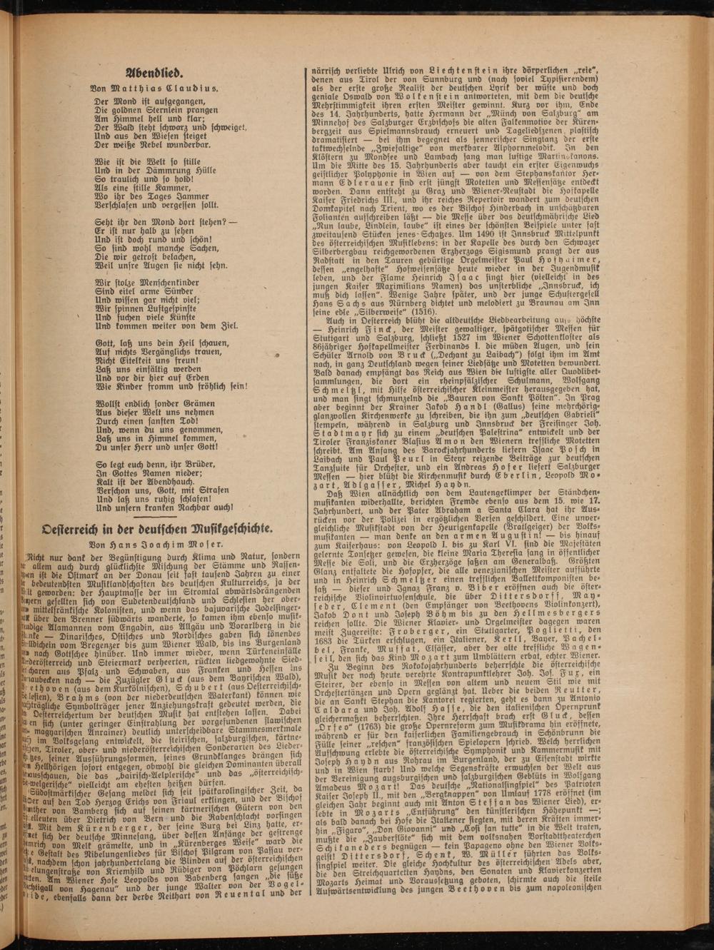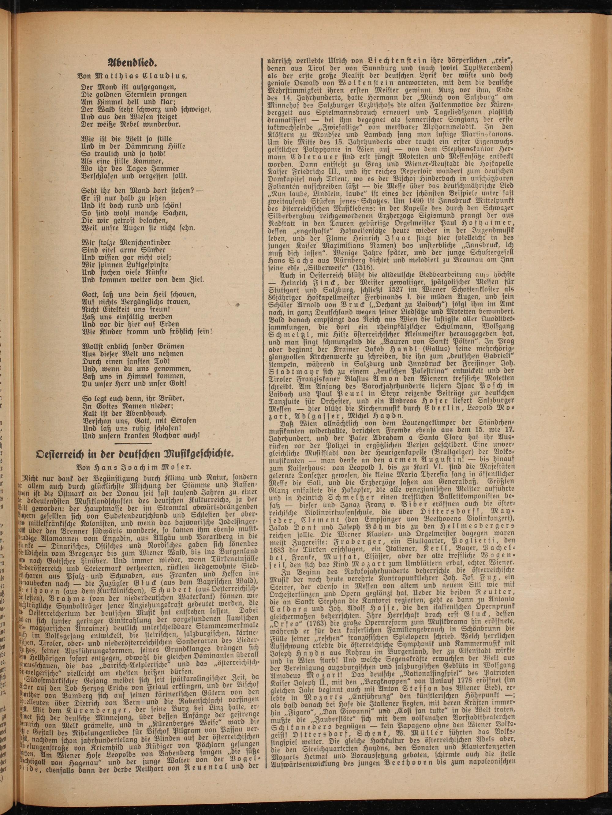 Nicht nur dank der Begünstigung durch Klima und Natur, sondern it allem auch durch glücklichste Mischung der Stämme und Rassen- tyitn ist die Ostmark an der Donau seit fast tausend Jahren zu einer bedeutendsten Musiklandschaften des deutschen Kulturreichs, ja der Bit geworden: der Hauptmasse der im Stromtal abwärtsdrängenden Bibern gesellten sich von Sudetendeutschland und Schlesien her Oberin* mittelfränkische Kolonisten, und wenn das bajuvarifche Jodelstnger-