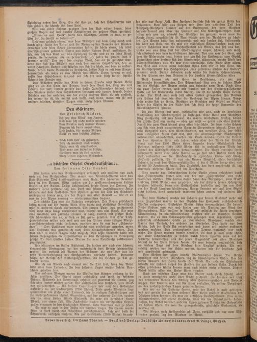Bald kamen wir mit ihnen in Berührung, als wir zur Adlersruhe hinaufkletterten. Der Schneestaub flog uns in dichten Massen ins Gesicht, der Sturm wehte uns beinahe vom Grat. Noch über ein paar Felsen empor, und wir standen vor der Erzherzog-Johann- Hütte auf der Adlersruhe (3465 Meter). Sie ist die höchste Hütte Oesterreichs. Der Blick war nach fast allen Seiten grenzenlos. Im Norden und Süden sah man bis über die Vorberge der Alpen hinaus. Bergkette reihte sich an Kette, Gletscher an Gletscher und Gipfel an Gipfel. Ueber die Gipfel in der Nähe hob sich stolz die spitze Pyramide des Miesbachhornes hinaus.