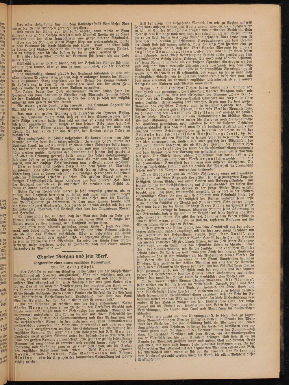 Erst der große und tiefgehende Wandel, den wir zu Beginn unseres Jahrzehnts ansetzen können, hat Squire unrecht gegeben. Sein Wegbereiter zu sein, ist Charles Morgans größtes und bleibendes Verdienst. Sein Werk ist dem Umfange nach noch nicht sehr erheblich: als sein Wesentlichstes hat er der Welt bisher drei große Romane geschenkt. Aber heute schon ist seine Stellung deutlich zu bestimmen. Prophezeiungen auf dem Gebiete der Kunst sind fast immer mißlich. Aber die Anzeichen sprechen eine zu deutliche Sprache dafür, daß das Werk Charles Morgans die große englische Romantradition weiterführen und in ihr einen festen Platz behaupten wird. Diese Ueberzeugung ist nicht allein genährt aus dem ungewöhnlichen Erfolg dieses Dichters. Sie wird nicht dadurch bestimmt, daß seine Romane in mehr als ein Dutzend Sprachen übertragen worden sind, daß man ihnen wertvolle Literaturpreise zuerkannte, daß dem Eng-/ länder die seltene Ehre der Aufnahme in die französische Ehrenlegion zuteil wurde. Im Gegenteil: es ist erstaunlich, daß einem im letzten nicht leicht zugänglichen Schaffen ein so überwältigender Erfolg befchieden war, mit Dem man eigentlich im normalen englischen Literaturbetrieb eine andere Kategorie von Autoren und Werken auszeichnet.