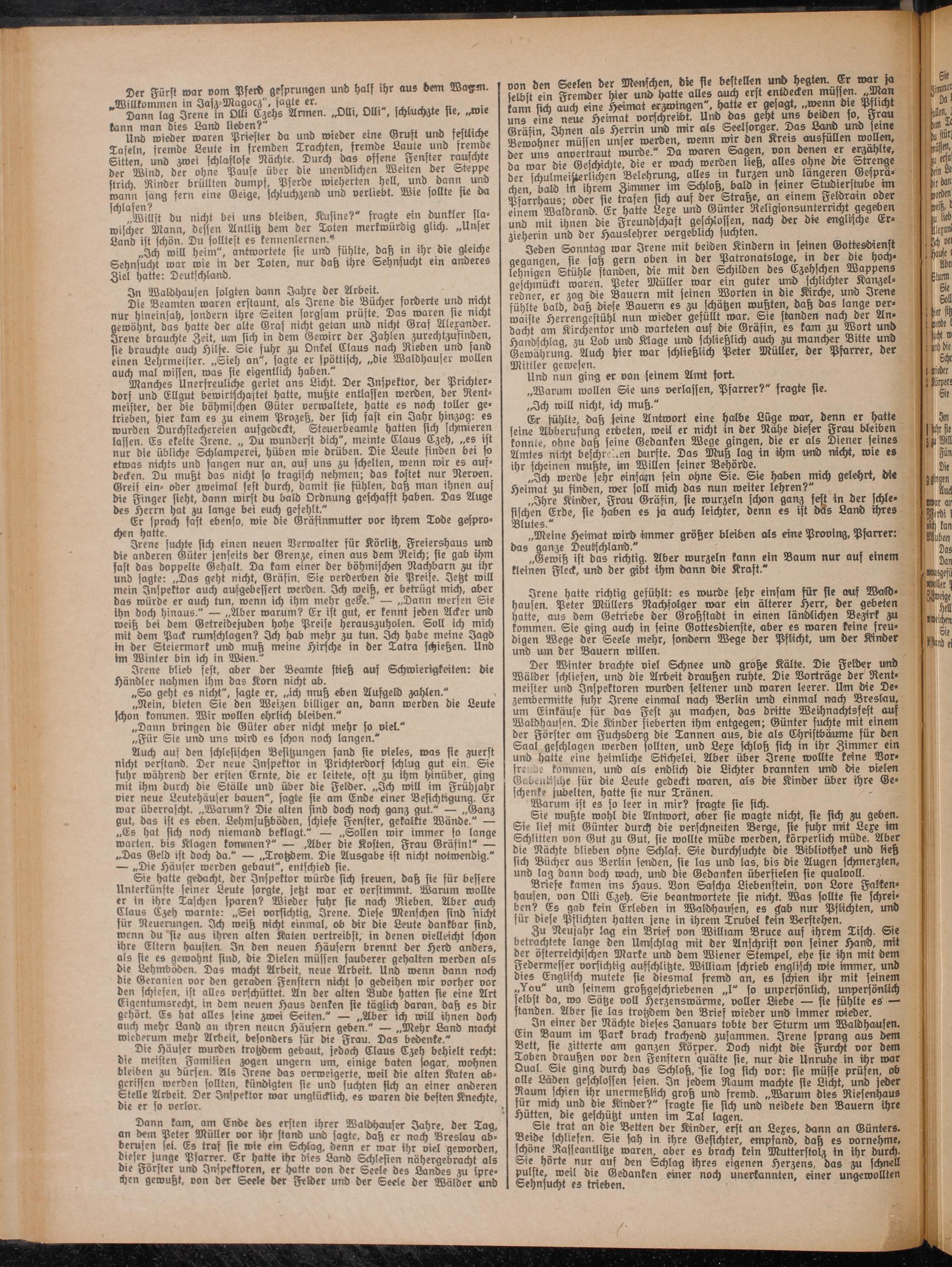 Irene suchte sich einen neuen Verwalter für Körlitz, Freiershaus und die anderen Güter jenseits der Grenze, einen aus dem Reich; sie gab ihm fast das doppelte Gehalt. Da kam einer der böhmifchen Nachbarn zu chr und fagte: „Das geht nicht, Gräfin. Sie verderben die Preise. Jetzt will mein Inspektor auch aufgebessert werden. Ich weiß, er betrügt mich, aber das würde er auch tun, wenn ich ihm mehr gebe." — „Dann werfen Sie ihn doch hinaus." — „Aber warum? Er ist gut, er kennt jeden Acker und weiß bei dem Getreidejuden hohe Preise herauszuholen. Soll ich mich mit dem Pack rumfchlagen? Ich hab mehr zu tun. Ich habe meine Jagd in der Steiermark und muh meine Hirsche in der Tatra schießen. Und hn Winter bin ich in Wien."