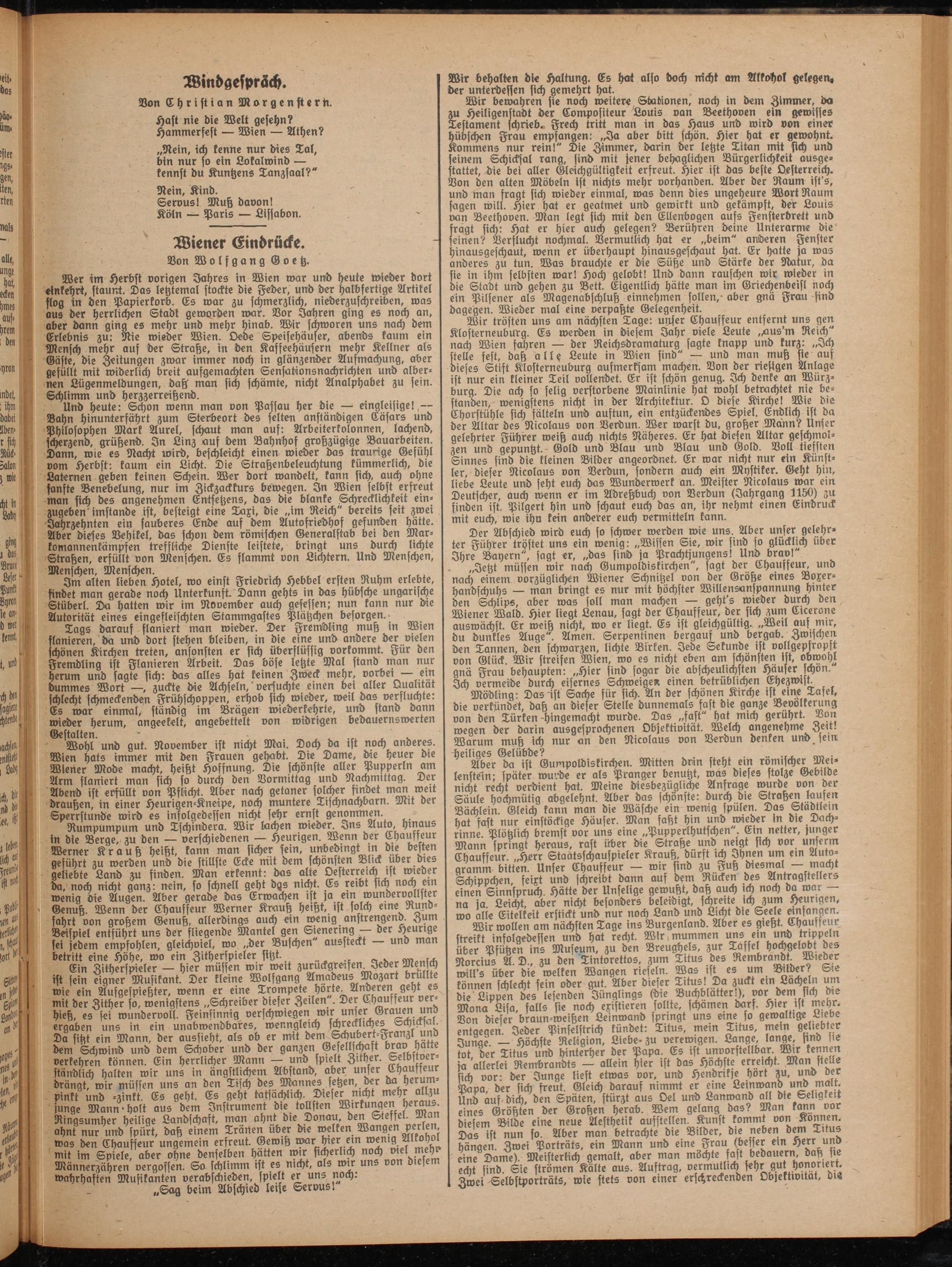 Wer im Herbst vorigen Jahres in Wien war und heute wieder dort einkehrt, staunt. Das letztemal stockte die Feder, und der halbsertig« Artikel flog in den Papierkorb. Es war zu schmerzlich, niederzuschreiben, was aus der herrlichen Stadt geworden war. Vor Jahren ging es noch an, aber dann ging es mehr und mehr hinab. Wir schworen uns nach dem Erlebnis zu: Nie wieder Wien. Oede Speisehauser, abends kaum ein Mensch mehr auf der Straße, in den Kaffeehäusern mehr Kellner als Gäste, die Zeitungen zwar immer noch in glänzender Aufmachung, aber gefällt mit widerlich breit aufgemachten Sensationsnachrichten und albernen Lügenmeldungen, daß man sich schämt«, nicht Analphabet zu sein. Schlimm und herzzerreißend.