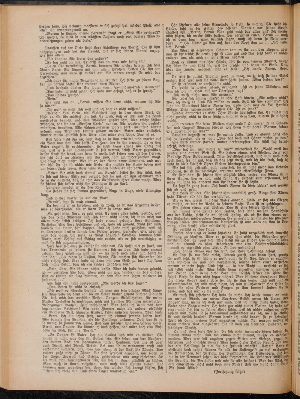 Und Lore sieht chn an, sieht, daß es in ihm arbeitet, und wartet auf ein Wort von ihm. Und hofft. Der Zorn, der in chr erwacht, als er den Vater angriff, ist verschwunden, sie fühlt sogar etwas wie Stolz auf ihn, weil er seinen Standpunkt so fest vertrat, selbst Vater gegenüber, dessen Kraft sie kennt, von dem sie weiß, daß keiner von all den Herren, die jetzt dort im Zimmer um ihn sind, ihm zu widersprechen wagt. Sie fragt nicht mehr: Wer ist er, der kleine arme Leutnant, und wer bin ich? In ihr ist nichts wie Liebe. Sie möchte die Arme heben und um seinen Hals legen. Aber seine Augen blicken an ihr vorbei.