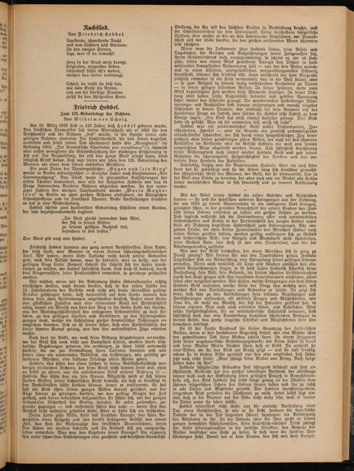 Am 18. März 1938 sind es 125 Jahre, daß Hebbel geboren wurde. Den friesischen Dramatiker sah meine Altersschaft, als er 1893 für den Buchhandel und die Bühnen „frei" wurde, in die Epoche seines endgültigen Ruhmes eintreten. Die Umstrittenhett, die sein Leben begleitet, verbittert und selbst seinen Tod überdauert hatte (die „Grenzboten" im Nekrolog 1863: „Der dramatische Charlatan par excellence"!!), schwand oder nahm wenigstens die Gesamtbejahung der mächtigen Erscheinung in Sauf. Die Bezweiflung, die erst das ganze Werk ersaßt hatte, blieb glich Kritik daran. Und nun feiern wir schon den 125. Geburtstag des Mannes als eines dem Streit entrückten Klassikers.