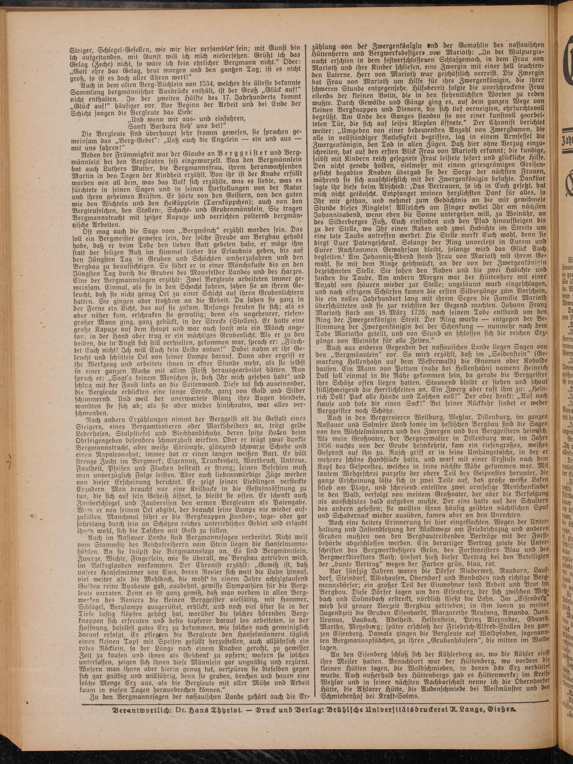 Auch in den Vergrevieren Weilburg, Wetzlar, Dillenburg, im ganzen Nassauer und Solmser Lank» sowie im hessischen Bergbau sind die Sagen von den Wichtelmännern und den Zwergen und den Berggeistern heimlich. Als mein Großvater, der Bergverwalter in Dillenburg war, im Jahre 1856 nachts von der Grube heimkehrte, kam ein riesengroßes, weißes Gespenst auf ihn zu. Rasch griff er in feine Umhängetasche, in der er mehrere schöne Handstücke hatte, und warf mit einer Erzstufe nach dem Kopf des Gespenstes, welches in seine nächste Nähe gekommen war. Mit lautem Wehgeschrei purzelte der obere Teil des Gespenstes herunter, die ganze Erscheinung löste sich in zwei Teile auf, das große weihe Laken blieb am Platze, und schreiend enteilten zwei armselige Menschenkinder in den Wald, verfolgt von meinem Großvater, der aber die Verfolgung als aussichtslos bald aufgeben mußte. Der eine hatte auf den Schultern des andern gesessen; sie wollten ihren häufig geübten nächtlichen Spul und Schabernack wieder ausüben, tarnen aber an den Unrechten.
