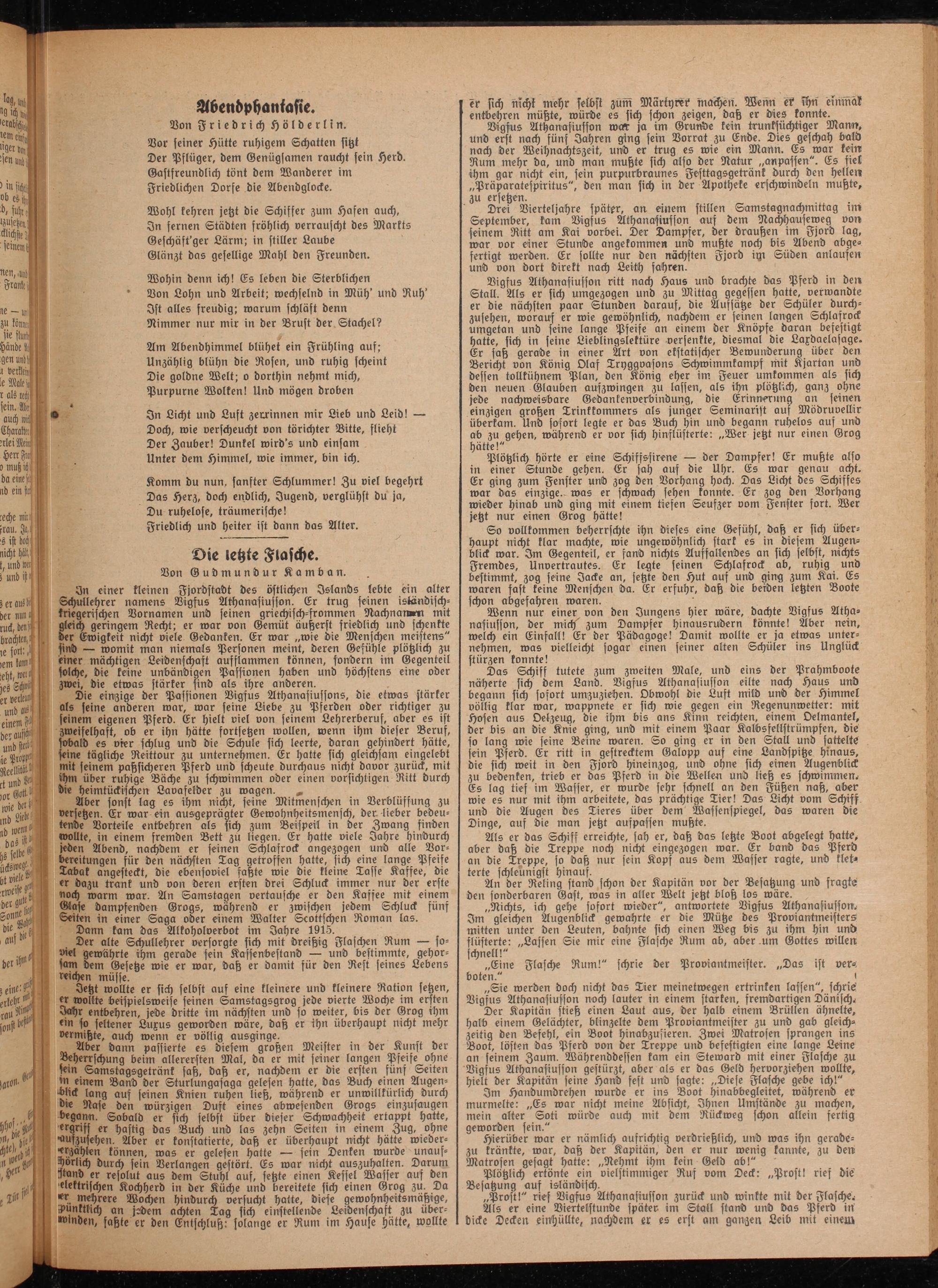 Vigfus Athanasiusson ritt nach Haus und bracht« das Pferd in den Stall. Als er sich umgezogen und zu Mittag gegessen hatte, verwandte er die nächsten paar Stunden darauf, die Aufsätze der Schüler durchzusehen, worauf er wie gewöhnlich, nachdem er feinen langen Schlafrock umgetan und feine lange Pfeife an einem der Knöpfe daran befestigt hatte, sich in feine ßieblingslettüre versenkte, diesmal die Laxdoelasage. Er saß gerade in einer Art von ekstatischer Bewunderung über den Bericht von König Olaf Tryggvasons Schwimmkampf mit Kjartan und dessen tollkühnem Plan, den König eher im Feuer umkommen als sich den neuen Glauben auszwingen zu lassen, als ihn plötzlich, ganz ohne jede nachweisbare Gedankenverbindung, die Erinnerung an feinen einzigen großen Trinkkommers als junger Seminarist auf Mödruvellir überkam. Und sofort legte er das Buch hin und begann ruhelos auf und ab zu gehen, während er vor sich hinslüstert«: „Wer jetzt nur einen Grog hätte!"