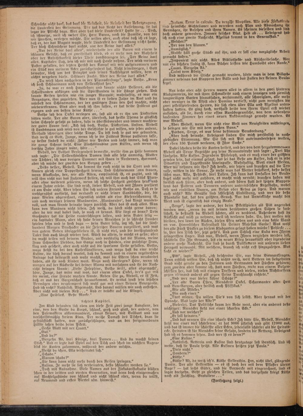 Botho sah den Onkel verlegen an, säst als ob er ihn um Diskretion bitten wolle. Der alte Baron aber, übersroh, das heikle Thema so glücklich beim Schöpse gefaßt zu haben, fuhr in überströmender und immer wachsender guter Laune fort: „Ach laß doch, Botho. Diskretion. Unsinn. Wedell ist Landsmann und wird von der Geschichte so gut wissen, wie jeder andere. Weshalb schweigen über solche Dinge. Du bist doch so gut wie gebunden. Und weiß es Gott, Junge, wenn ich so die Frölens Revue passieren lasse, ne bessre findest du nicht; Zähne wie Perlen und lacht immer, daß man die ganze Schnur sieht. Eine Flachsblondine zum Küssen, und wenn ich dreißig Jahre jünger wäre, höre ..."