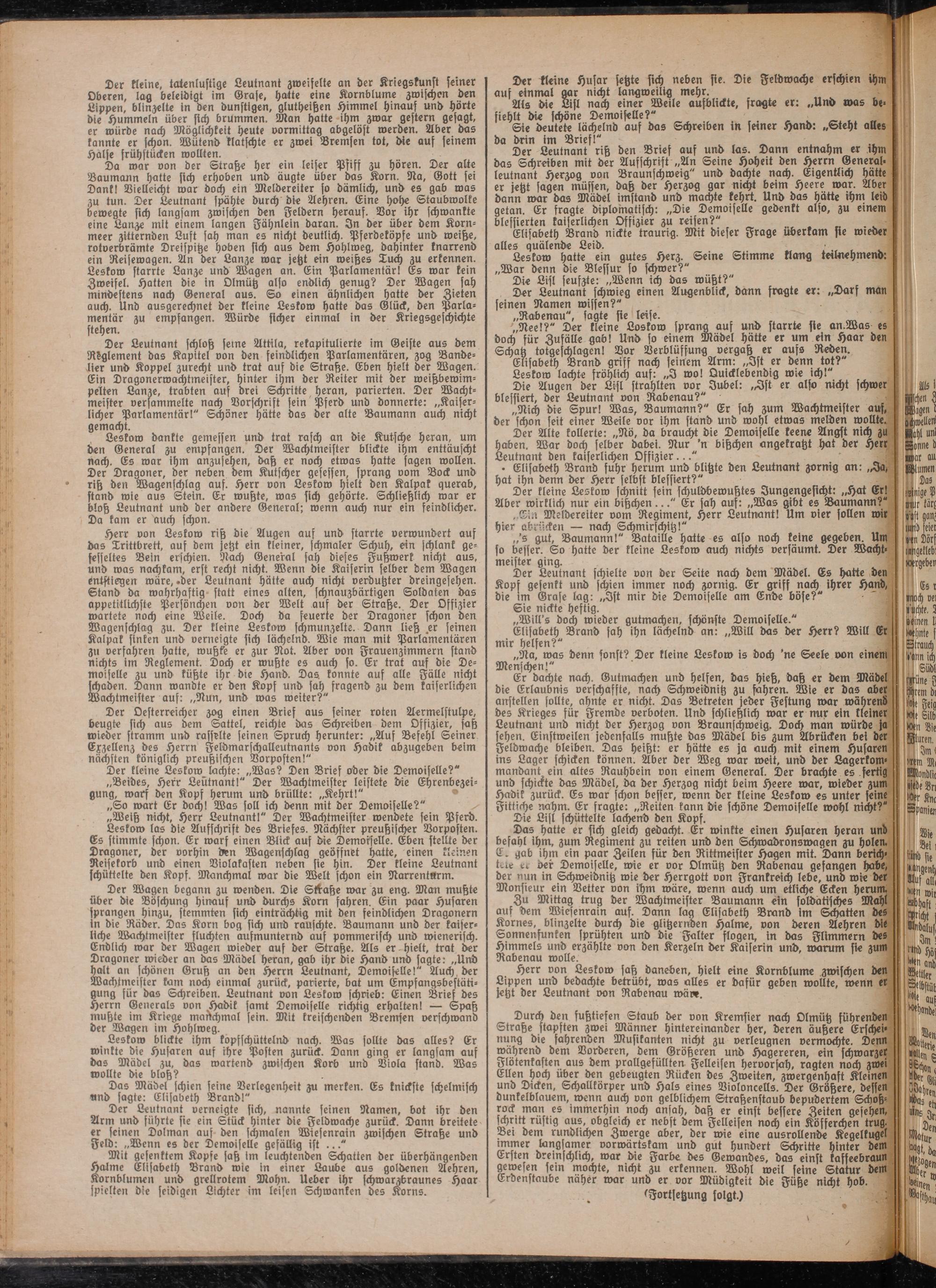 Zu Mittag trug der Wachtmeister Baumann ein soldatisches Mahl auf dem Wiesenrain auf. Dann lag Elisabeth Brand im Schatten des Kornes, blinzelte durch die glitzernden Halme, von deren Aehren die Sonnenfunken sprühten und die Falter flogen, in das Flimmern des Himmels und erzählte von den Kerzeln der Kaiserin und, warum sie zum Rabenau wolle.