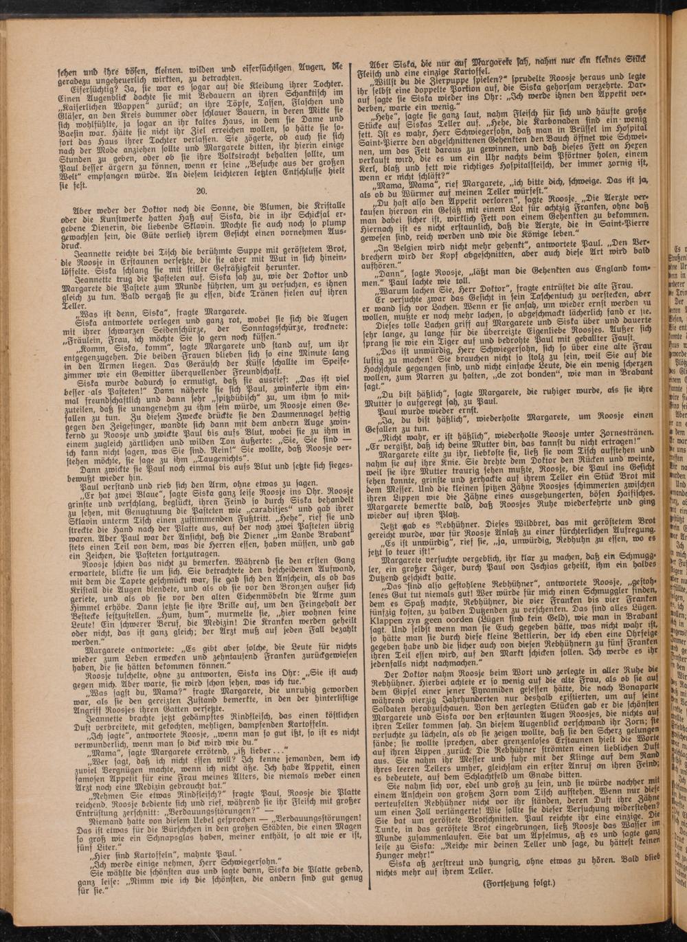 Roosje schien das nicht zu bemerken. Wahrend sie den ersten Gang erwartete, blickte sie um sich. Sie betrachtete den bescheidenen Aufwand, mit dem die Tapete geschmückt war, sie gab sich den Anschein, als ob das Kristall die Augen blendete, und als ob sie vor den Bronzen außer sich I geriete und als ob sie vor den alten Eichenmöbeln die Arme zum Himmel erhöbe. Dann setzte sie ihre Brille auf, um den Feingehalt der Bestecke festzustellen. „Hum, hum", murmelte sie, „hier wohnen feine Leute! Ein schwerer Beruf, die Medizin! Die Kranken werden gehe.ll oder nicht, das ist ganz gleich; der Arzt muß auf leben Fall bezahlt