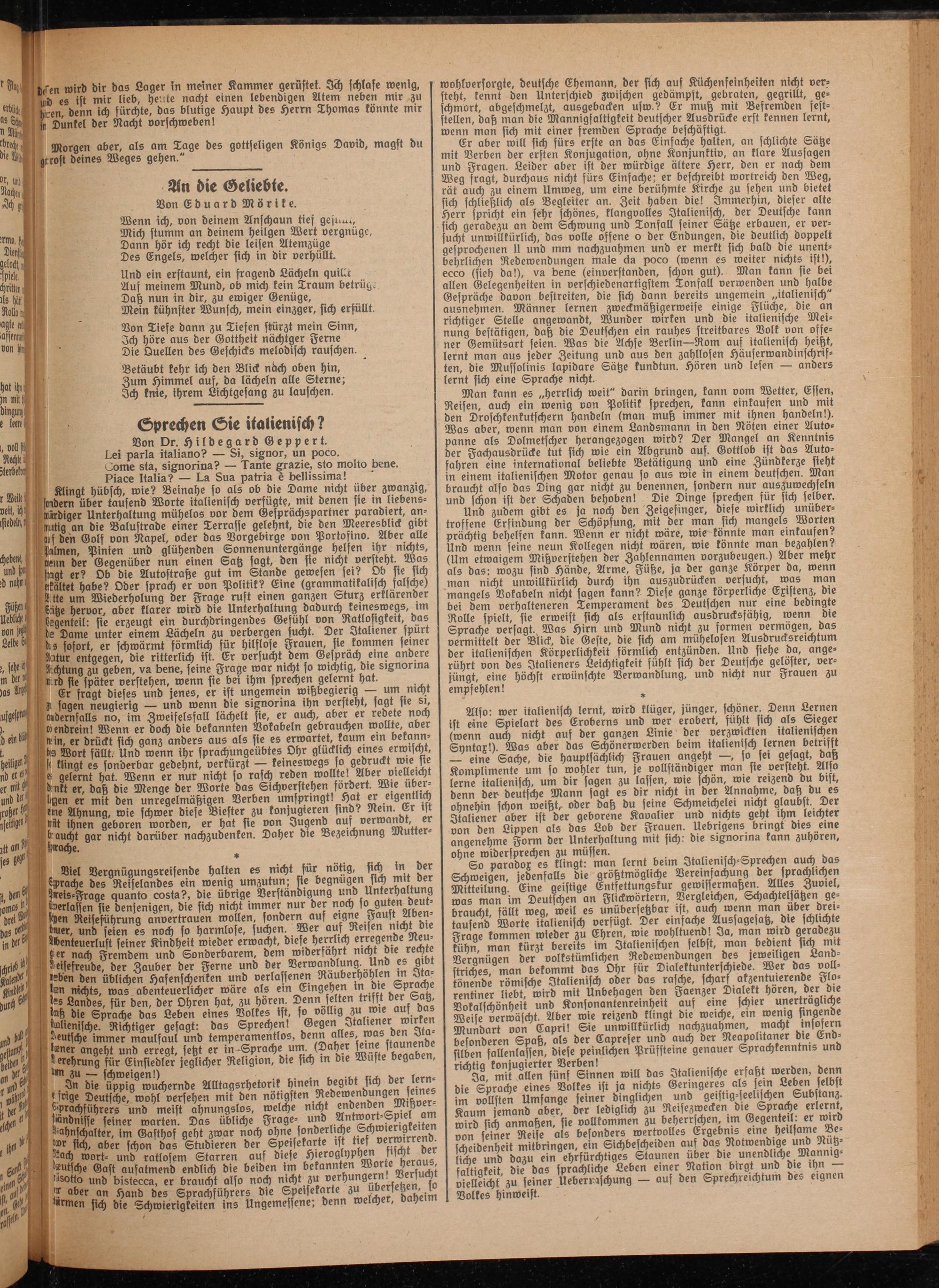 Klingt hübsch, wie? Beinahe so als ob die Dame nicht über zwanzig, |mbern über tausend Worte italienisch verfügte, mit denen sie in liebenswürdiger Unterhaltung mühelos vor dem Gesprächspartner paradiert, an- nutig an die Balustrade einer Terrasse gelehnt, die den Meeresblick gibt 8i| den Golf von Napel, oder das Vorgebirge von Portofino. Aber alle Pümen, Pinien und glühenden Sonnenuntergänge helfen ihr nichts, wenn der Gegenüber nun einen Satz sagt, den sie nicht versteht. Was fügt er? Ob die Autostraße gut im Stande gewesen sei? Ob ste sich Gältet habe? Oder sprach er von Politik? Eine (grammatikalisch falsche) Litte um Wiederholung der Frage ruft einen ganzen Sturz erklärender Litze hervor, aber klarer wird die Unterhaltung dadurch keineswegs, im fegenteil: sie erzeugt ein durchdringendes Gefühl von Ratlosigkeit, das hie Dame unter einem Lächeln zu verbergen sucht. Der Italiener spurt V-s sosort, er schwärmt förmlich für hilflose Frauen, sie kommen seiner Statur entgegen, die ritterlich ist. Er versucht dem Gespräch eine andere Achtung zu geben, va bene, seine Frage war nicht so wichtig, die signorina tirb sie später verstehen, wenn sie bei ihm sprechen gelernt hat.