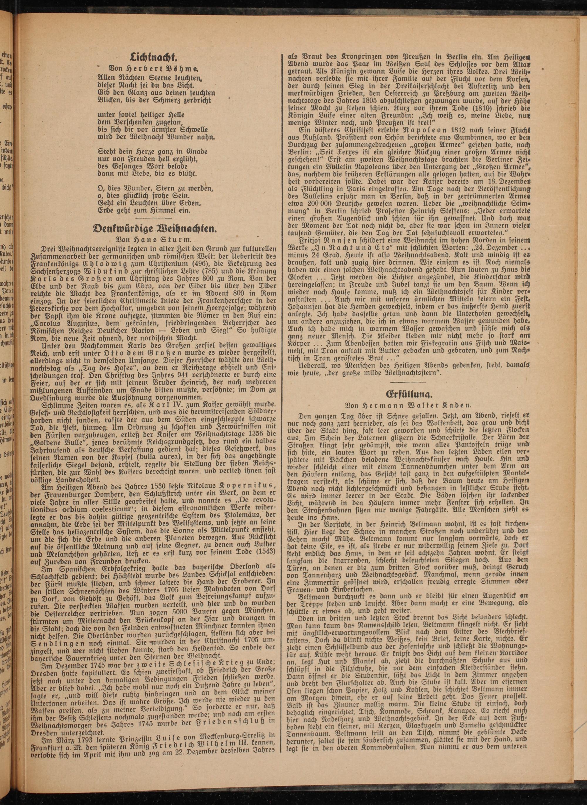 Ein düsteres Christfest erlebte Napoleon 1812 nach seiner Flucht aus Rußland. Präsident von Schön berichtete aus Gumbinnen, wo er den Durchzug der zusammengebrochenen „großen Armee" gesehen hatte, nach Berlin: „Seit Terxes ist ein gleicher Rückzug einer großen Armee nicht geschehen!" Erst am zweiten Weihnachtstage brachten die Berliner Zeitungen ein Bulletin Napoleons über den Untergang der „Großen Armee", das, nachdem die früheren Erklärungen alle gelogen hatten, auf die Wahrheit vorbereiten sollte. Dabei war der Kaiser bereits am 18. Dezembe« als Flüchtling in Paris eingetroffen. Am Tage nach der Veröffentlichung des Bulletins erfuhr man in Berlin, daß in der zertrümmerten Arme« etwa 200 000 Deutsche gewesen waren. Ueber die „weihnachtliche Stimmung" in Berlin schrieb Professor Heinrich Steffens: „Jeder erwartet« einen großen Augenblick und schien für ihn gewafsnet. Und doch wat der Moment der Tat noch nicht da, aber sie war schon im Innern viele» tausend Gemüter, die den Tag der Tat sehnsuchtsvoll erwarteten."