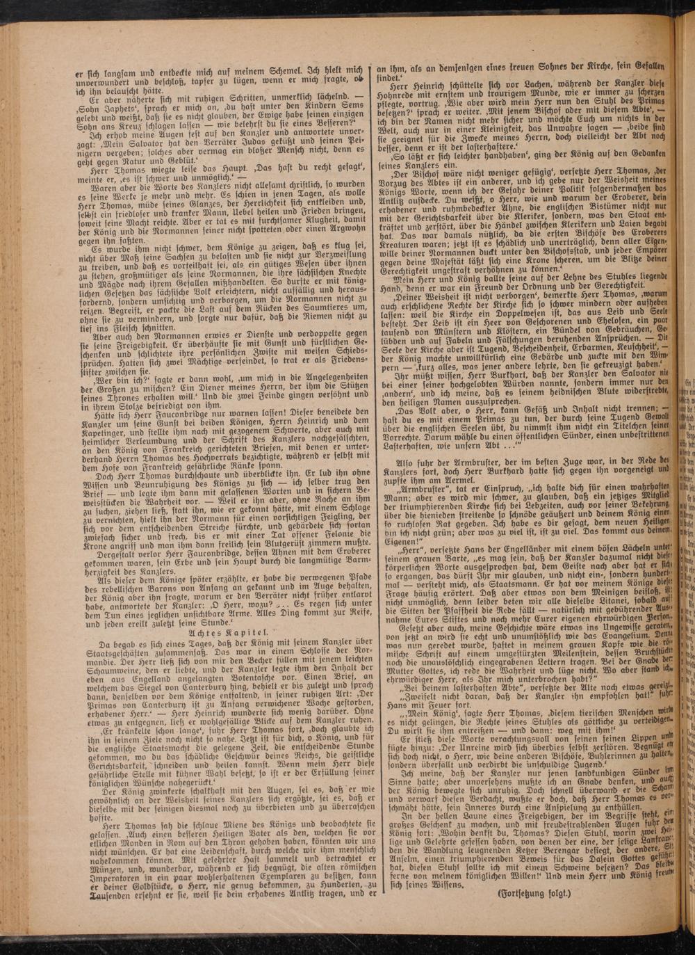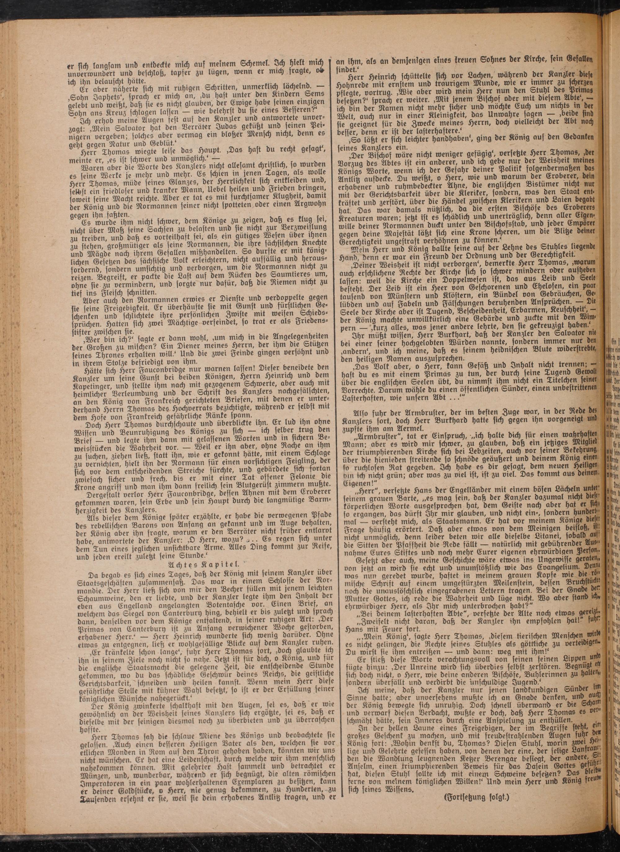 Da begab es sich eines Tages, daß der König mit feinem Kanzler über Staatsgeschäften zusammenfah. Das war in einem Schloße der Normandie. Der Herr ließ sich von mir den Becher füllen mit jenem letcbten Schaumweine, den er liebte, und der Kanzler legte ihm den Inhalt der eben aus Engelland angelangten Botentasche vor. Einen Brief, an welchem das Siegel von Canterbury hing, behielt er bis zuletzt und sprach dann, denselben vor dem Könige entfaltend, in seiner ruhigen Art: ,Der Primas von Canterbury ist zu Anfang verwichener Woche gestorben, erhabener Herr.' — Herr Heinrich wunderte sich wenig darüber. Ohne etwas zu entgegnen, ließ er wohlgefällige Blicke auf dem Kanzler ruhen.