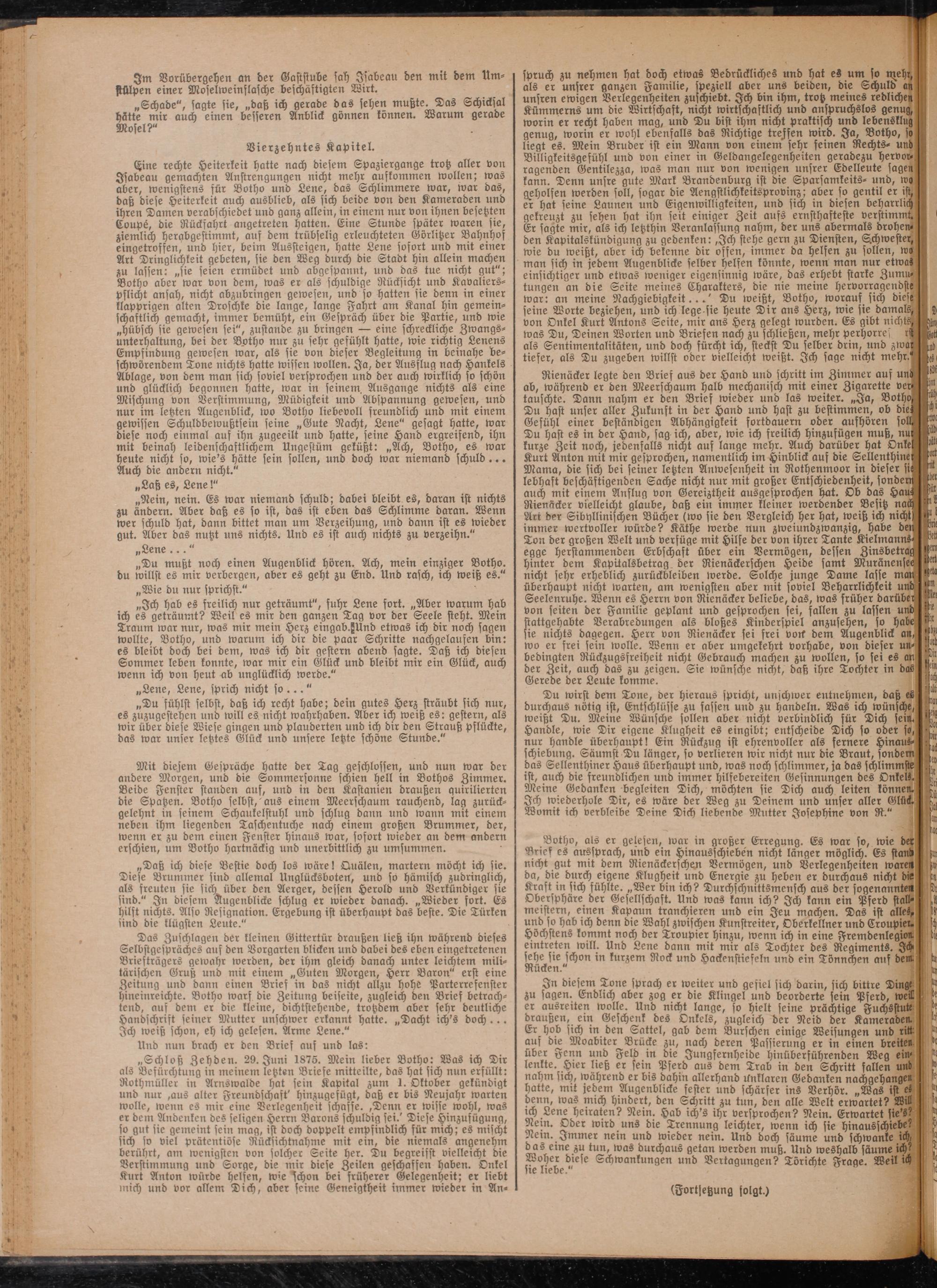 Das Zuschlägen der kleinen Gittertür draußen ließ ihn während dieses Selbstgespräches auf den Vorgarten blicken und dabei des eben eingetretenen Briefträgers gewahr werden, der ihm gleich danach unter leichtem militärischen Gruß und mit einem „Guten Morgen, Herr Baron" erst eine Zeitung und dann einen Brief in das nicht allzu hohe Parterrefenster hineinreichte. Botho warf die Zeitung beiseite, zugleich den Brief betrachtend, auf dem er die kleine, dichtstehende, trotzdem aber sehr deutliche Handschrift seiner Mutter unschwer erkannt hatte. „Dacht ich's doch... Ich weiß schon, eh ich gelesen. Arme Lene."