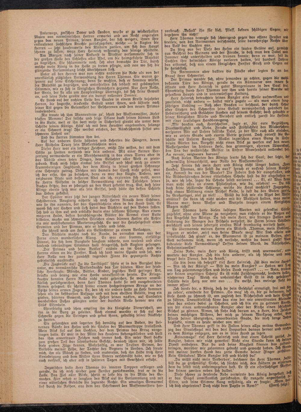 Der Primas wandte sich, ohne jemandes zu achten, gegen Oie wohlbekannte Türe des Königs, gerade da ein Kämmerer von innen fii öffnete und Herr Heinrich in guter Morgenlaune in den ©aal trat. Ehrerbietig stand Herr Thomas vor ihm und harrte feiner Anrede mit gefenttem Haupte und in unterwürfiger Haltung.