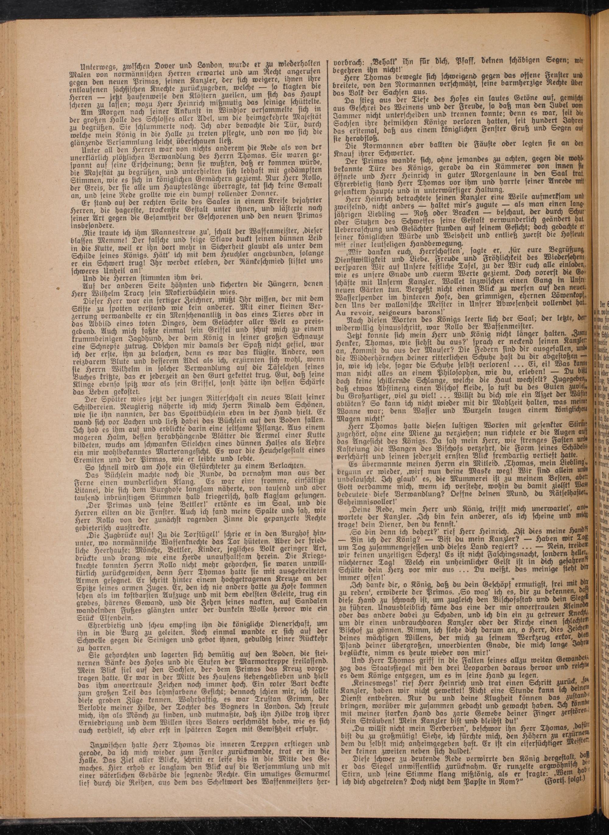 Diese schwer zu deutend« Rede verwirrte den König dergestalt, er das Siegel unwissentlich zurücknahm. Er runzelte argwöhnisch Stirn, und seine Stimme klang mißtonig, als er fragte: .Wem ich dich abgetreten? Doch nicht dem Papste in Rom?" (Forts- folg"