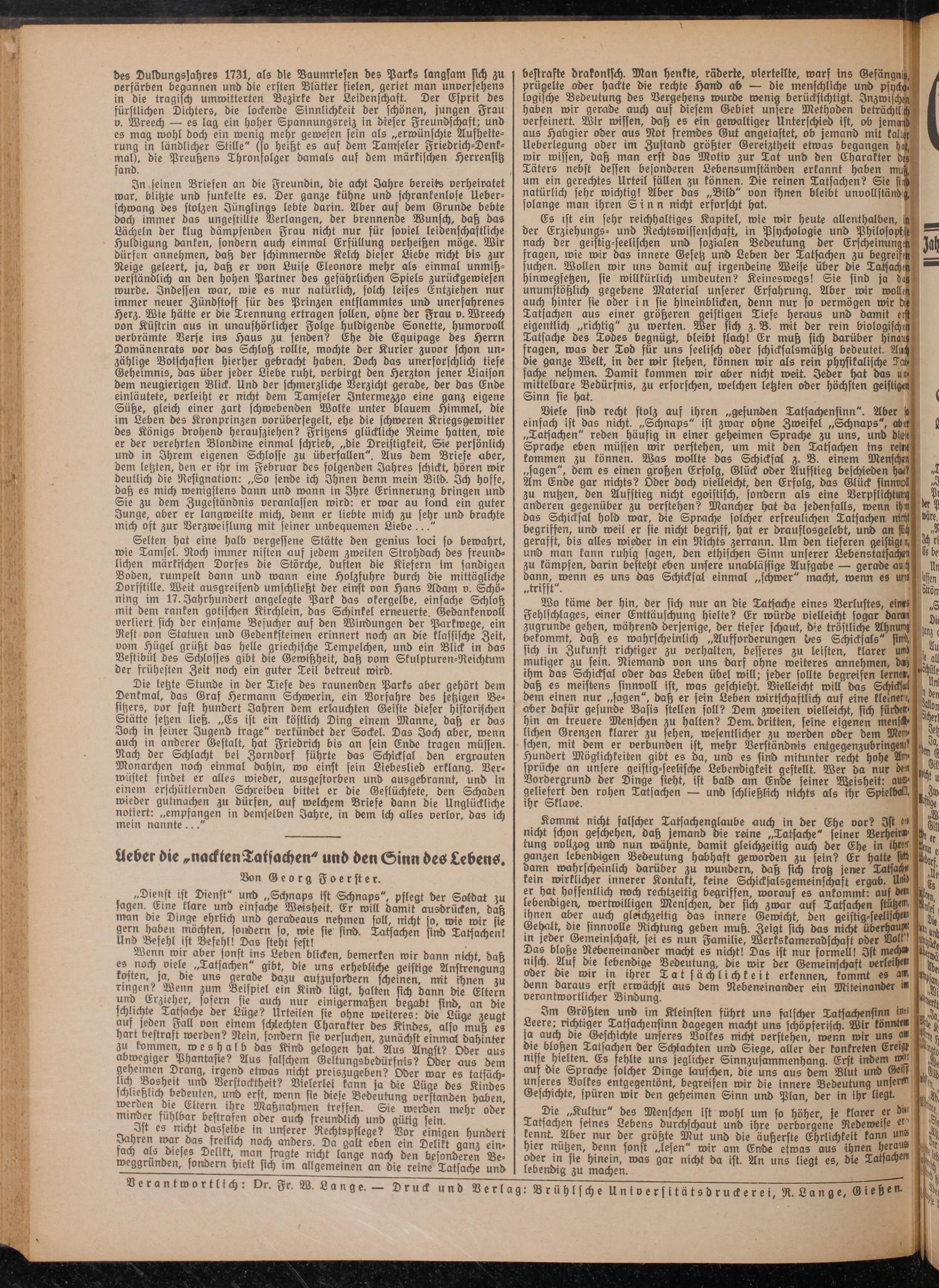 Die „Kultur" des Menschen ist wohl um so höher, je klarer er bin Tatsachen seines Lebens durchschaut und ihre verborgene Redeweise er kennt. Aber nur der größte Mut und die äußerste Ehrlichkeit kann uns hier nützen, denn sonst „lesen" wir am End« etwas aus ihnen 6 er aus aber in sie hinein, was gar nicht da ist. An uns liegt es, die Tatsachen lebeirdig zu machen.
