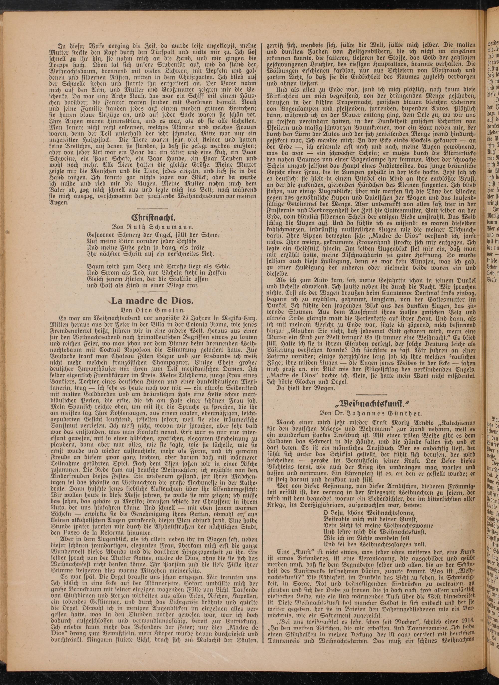 Aber in dem Augenblick, als ich allein neben ihr im Wagen sah, neben dieser schönen fremdartigen, eleganten Frau, überkam mich erst die ganze Wunderwelt dieses Abends und die dankbare Hingezogenheit zu ihr. Sie selber sprach von der Mutter Gottes, madre de Dios, ohne die sie sich das Weihnachtsfest nicht denken könne. Ihr Parfüm und die tiefe Fülle ihrer Stimme steigerten dies warme Mitgehen meinerseits.