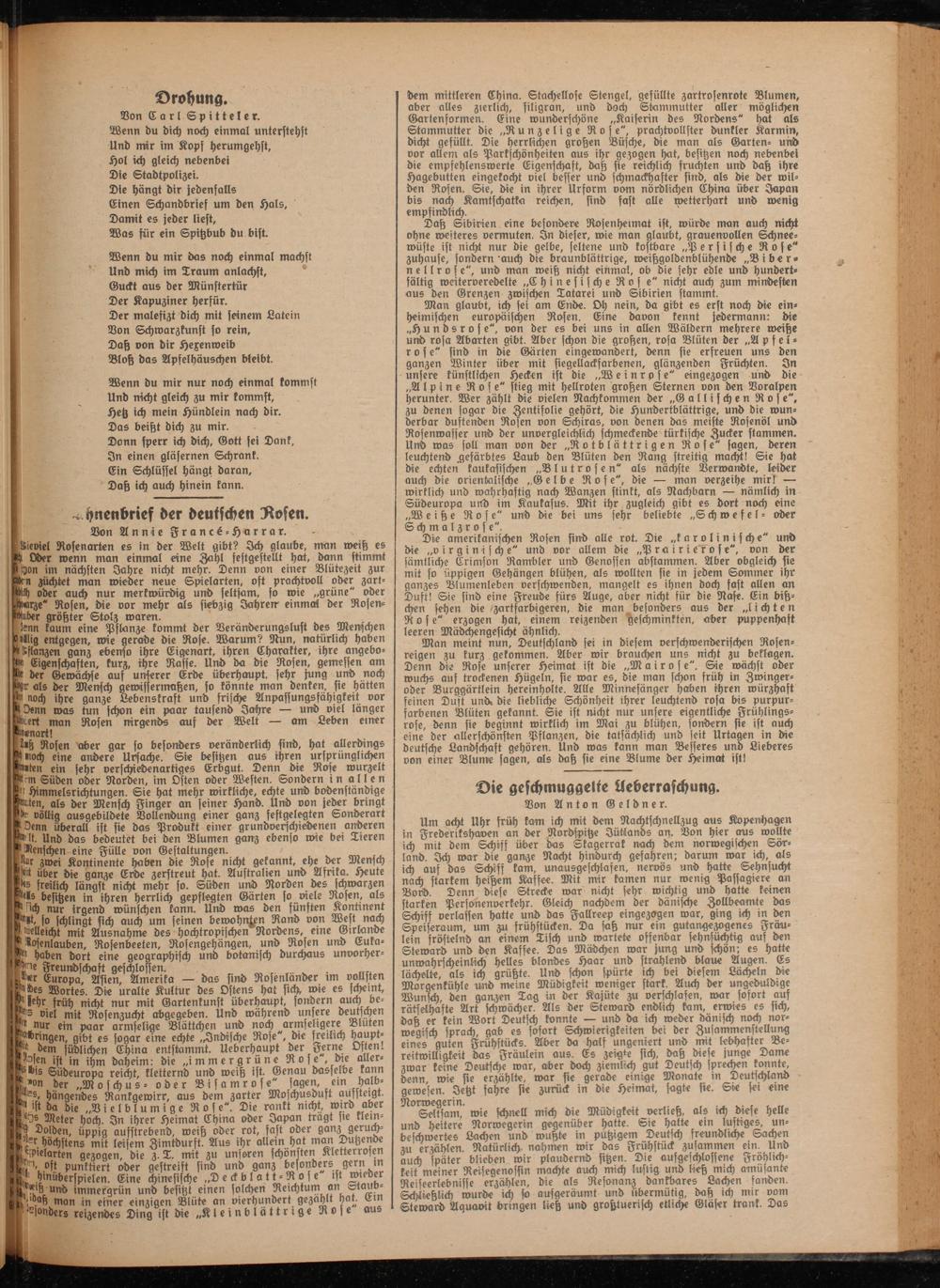 liieviel Rosenarten es in der Welt gibt? Ich glaube, man weiß es ß Oder wenn man einmal eine Zahl feftgestellt hat, dann stimmt Ition im nächsten Jahre nicht mehr. Denn von einer Blütezeit zur ihm züchtet man wieder neue Spielarten, oft prachtvoll oder zart- hilil) oder auch nur merkwürdig und seltsam, so wie „grüne" oder Lfetorjc" Rosen, die vor mehr als siebzig Jahreir einmal der Rosem pltber größter Stolz waren.