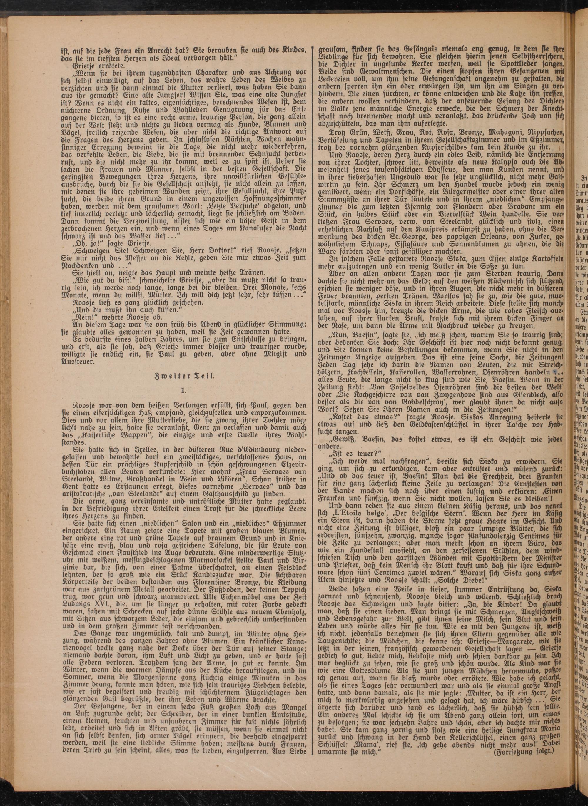 Roosje war von dem heißen Verlangen erfüllt, sich Paul, gegen den sie einen eifersüchtigen Haß empfand, gleichzustellen und emporzukommen. Dies und vor allem ihre Mutterliebe, die sie zwang, ihrer Tochter möglichst nahe zu fein, hatte sie veranlaßt, Gent zu verlassen und damit auch das „Kaiserliche Wappen", die einzige und erste Quelle ihres Wohlstandes.