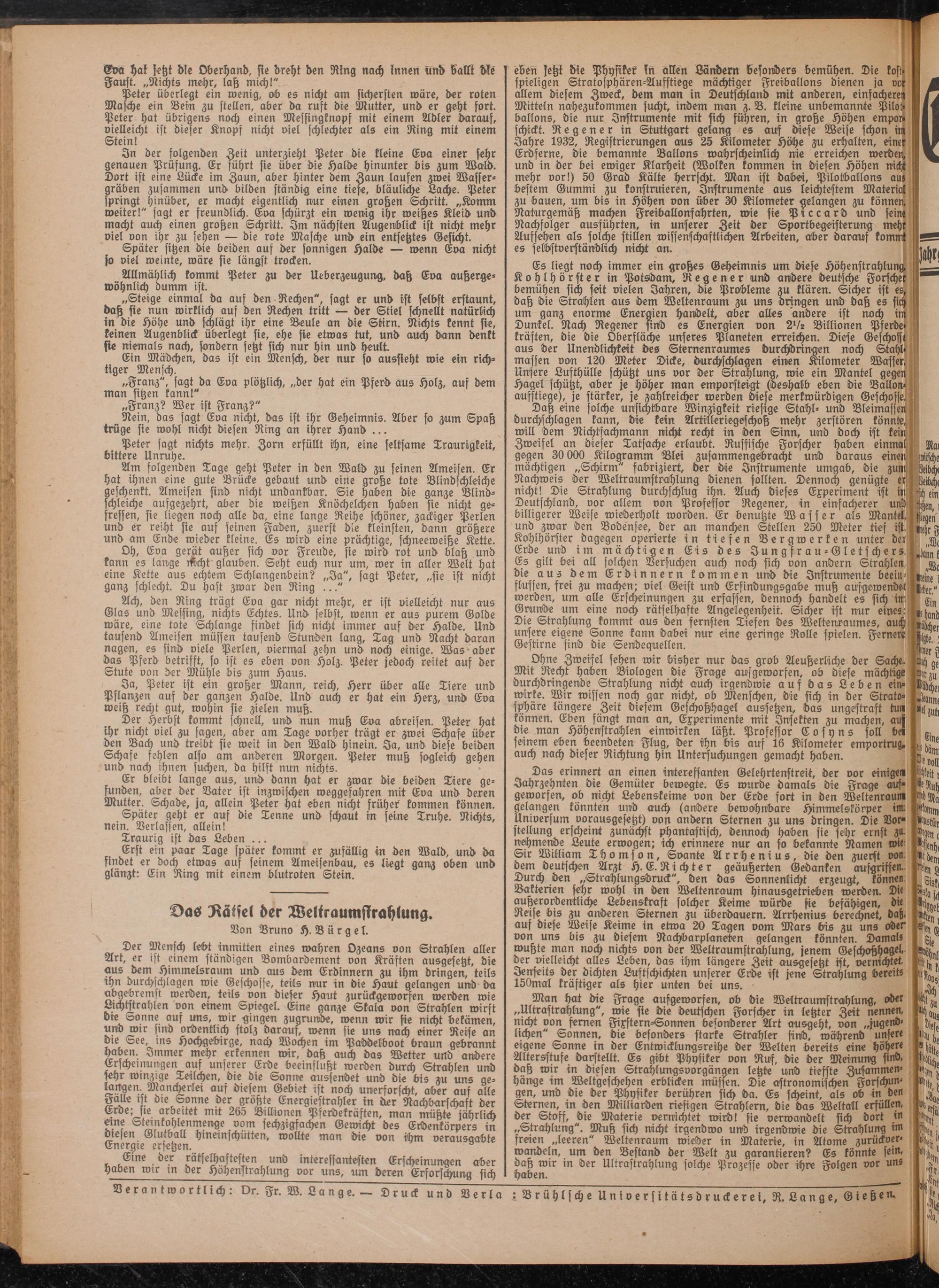 bemühen sich seit vielen Jahren, die Probleme zu klären. Sicher ist es, daß die Strahlen aus dem Weltenraum zu uns bringen und daß es sich um ganz enorme Energien handelt, aber alles andere ist noch im Dunkel. Nach Siegener sind es Energien von 2Vs Billionen Pferde- kräften, die die Oberfläche unseres Planeten erreichen. Diese Geschofft aus der Unendlichkeit des Sternenraumes durchdringen noch Stahl- maffen von 120 Meter Dicke, durchschlagen einen Kilometer Wasser. Unsere Lufthülle schützt uns vor der Strahlung, wie ein Mantel gegen Hagel schützt, aber je höher man emporsteigt (deshalb eben die Ballon- aufftiege), je stärker, je zahlreicher werben diese merkwürdigen Geschosse.