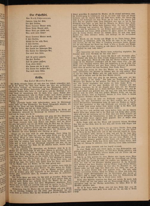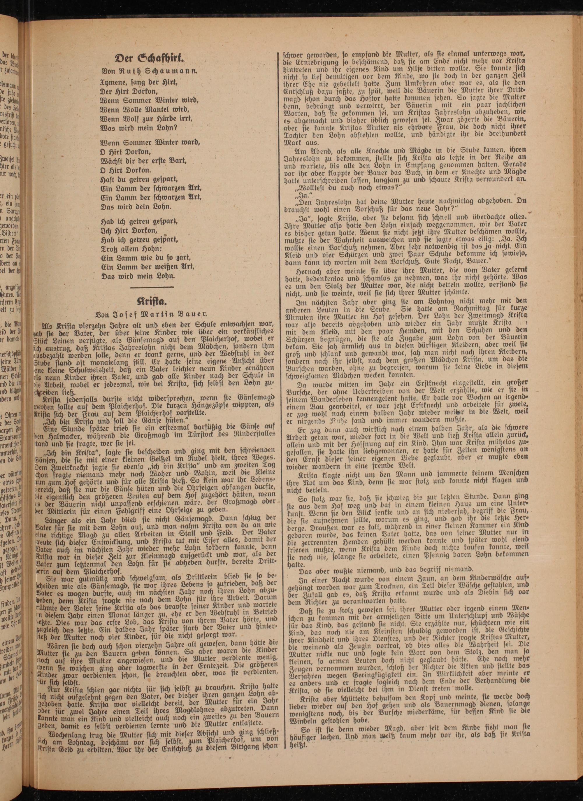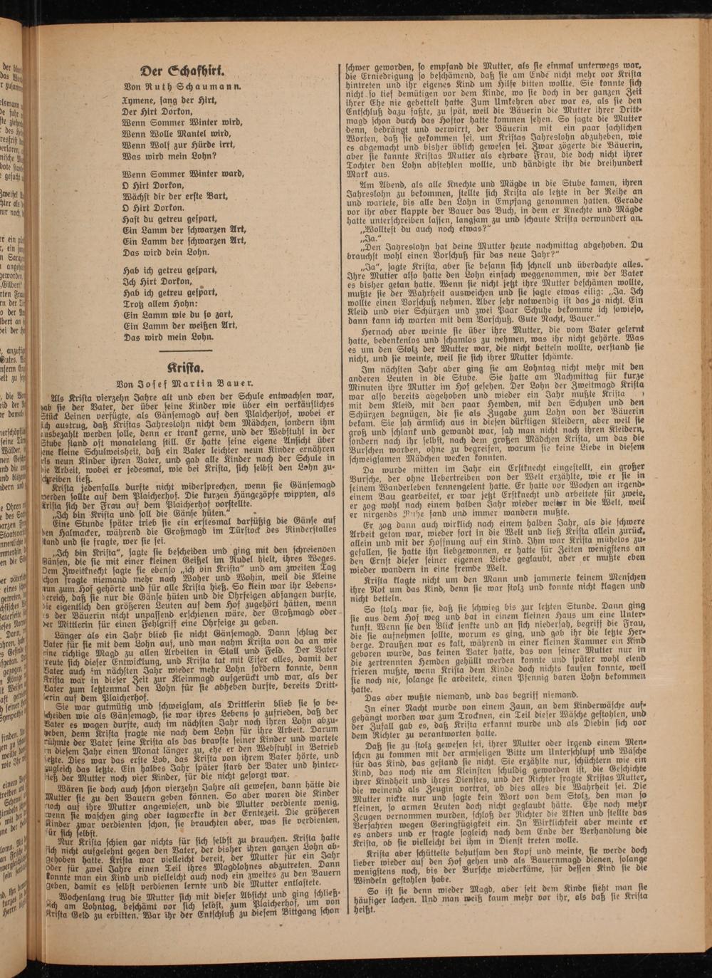 Als Krista vierzehn Jahre alt und eben der Schul« entwachsen war, »ab sie der Vater, der über feine Kinder wie über ein verkäufliches Stück Seinen verfügte, als Gänsemagd auf den Plaicherhof, wobei er sich austrug, daß Kristas Jahreslohn nicht dem Mädchen, sondern ihm nisbezahlt werden falle, denn er traut gerne, und der Webstuhl in der Stube stand oft monatelang still. Er hatte feine eigene Ansicht über |ene kleine Schulweisheit, daß ein Vater leichter neun Kinder ernähren tls neun Kinder ihren Vater, und gab alle Kinder nach der Schule in i-ie Arbeit, wobei er jedesmal, wie bei Krista, sich selbst den Lohn zu- | schleichen ließ. , „ .__.