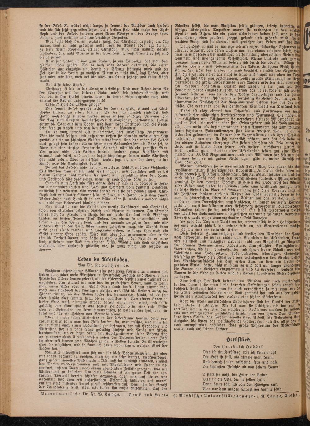 Nachdem unsere ganze Bildung eine papierene Form angenommen hat, hoben ganz sicher mehr Menschen in Frankreich Gedichte und Romane zum Preise des Ackers kennengelernt, als die Ackererde selbst einmal aufmerksam angesehen. Nur einmal tut man das im praktischen Leben, nämlich wenn man einen Acker ober ein Stück ©artenlanb tauft. Dann nimmt man wohl eine Hanbvoll des künftigen Besitzes auf, läßt die Krümel burch die Finger rinnen, ob der Boden locker fei, humusreich, feucht, ob er fett ober sandig oder lehmig, kurz, ob er fruchtbar fei. Von einem Leben in dieser Erd« weih nternanb etwas: darauf achtet man nicht, und tollte Zufällig dem Kauflustigen aus feiner Handvoll Erde eine rote Milbe ober ein Spinnchen den Arm hinauflaufen, so hält er das höchstens für fatal und für ein Zeichen von Verwahrlosung.