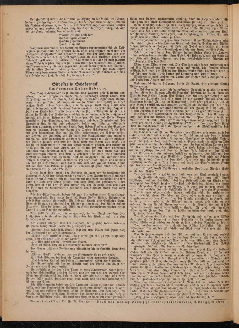 Die Silvesternacht bricht an. Die Turmuhr schlägt Stunde um Stunde falsch, und der Nachtwächter Schillripp tutet zum Ueberfluß in sein Horn und singt mit rostiger Stimme: „härt ihr Leut und laßt euch sagen, die Glocke, die hat elf geschlaaen. Bewahrt das Feuer und das Licht, vergeht den alten Schillripp nicht? So tutet und singt er schon seit einer stattlichen