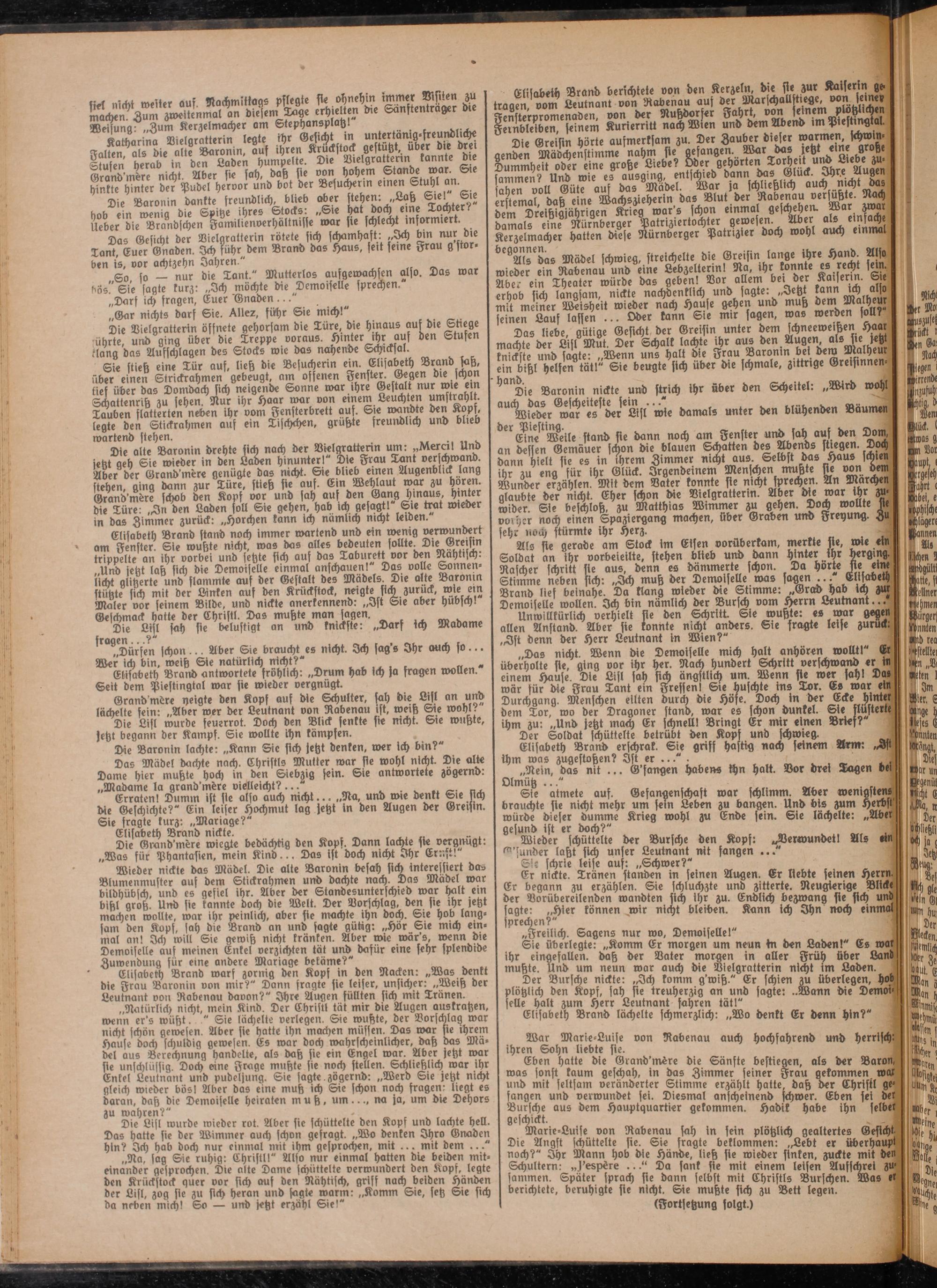 Als sie gerade am Stock im Eisen vorüberkam, merkte sie, wie ein Soldat an ihr vorbeieilte, stechen blieb und dann hinter ihr cherging. Rascher schritt sie aus, denn es dämmerte schon. Da horte sie eine Stimme neben sich: ,Hch muß der Demoiselle was sagen ... Elisabeth Brand lief beinahe. Da klang wieder die Stimme: „Grad hab ich zur Demoiselle wollen. Ich bin nämlich der Bursch vom Herrn Leutnant...
