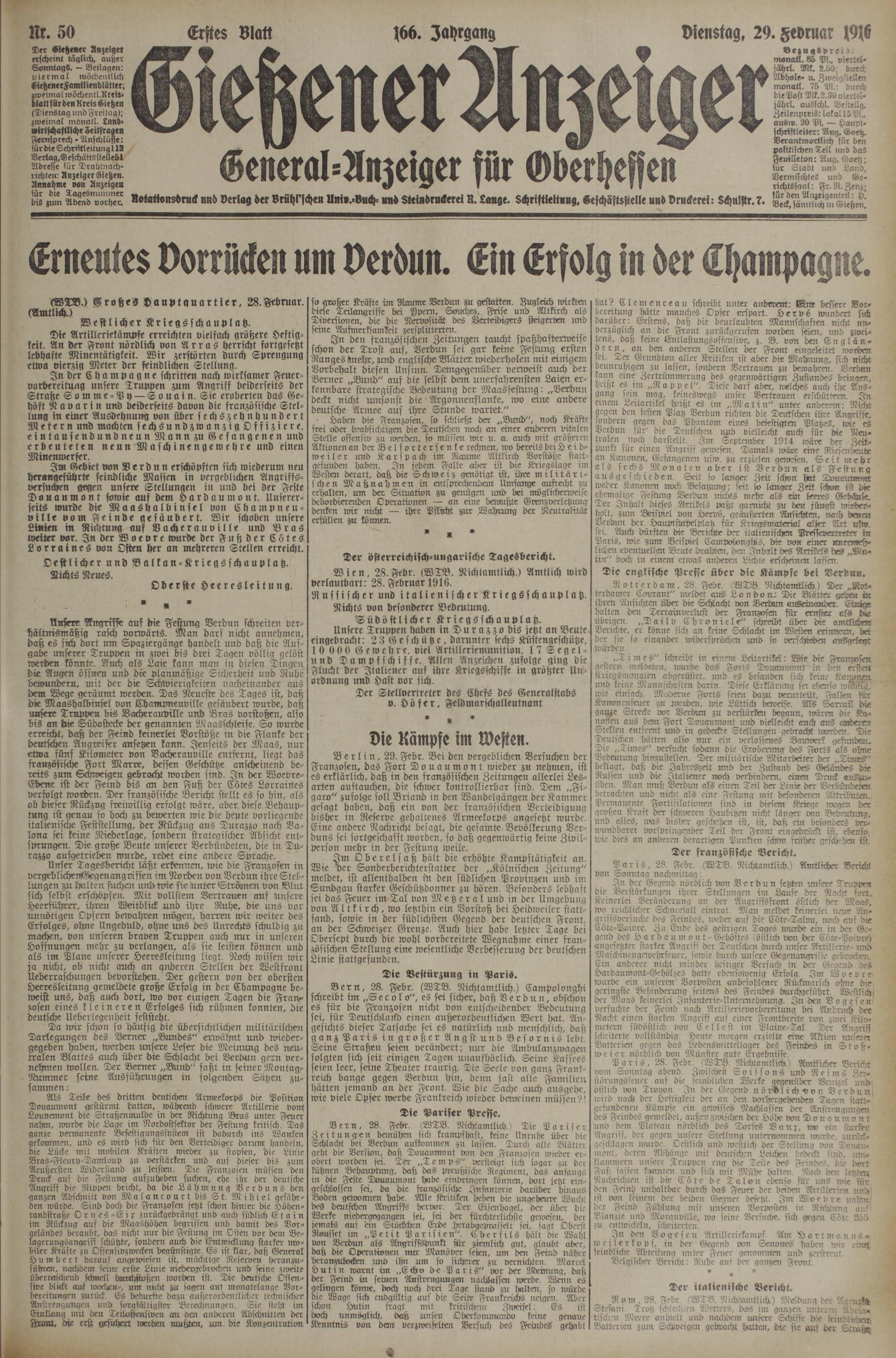 29.2.1916 Erstes Blatt