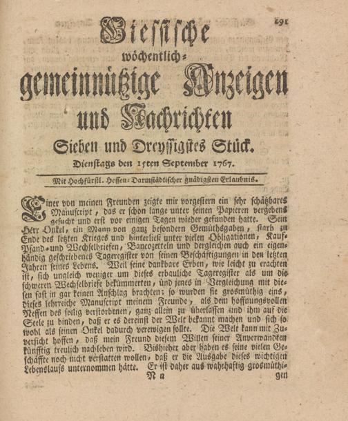 Giessische wöchentliche gemeinnützige Anzeigen und Nachrichten. 1764-1770