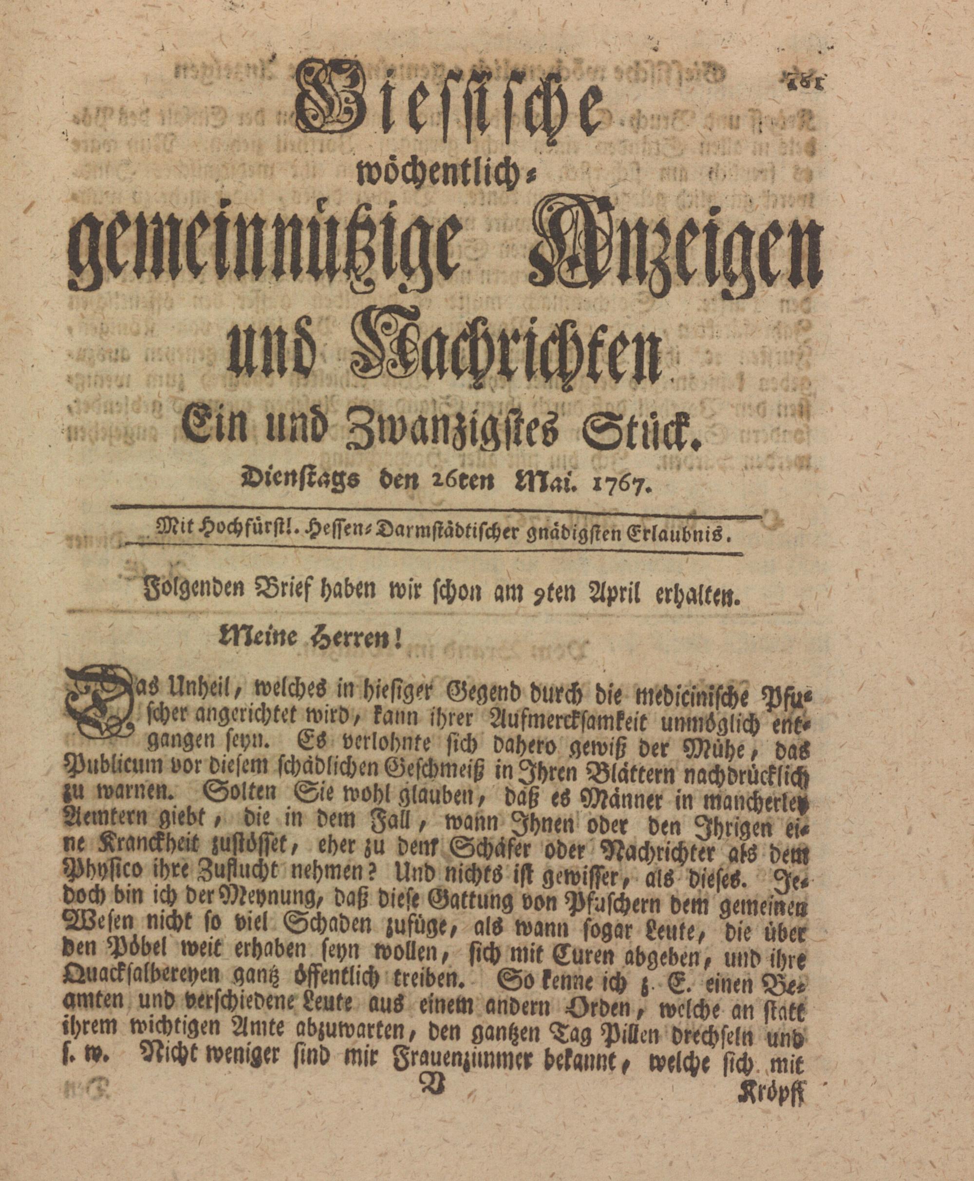 Giessische wöchentliche gemeinnützige Anzeigen und Nachrichten. 1764-1770