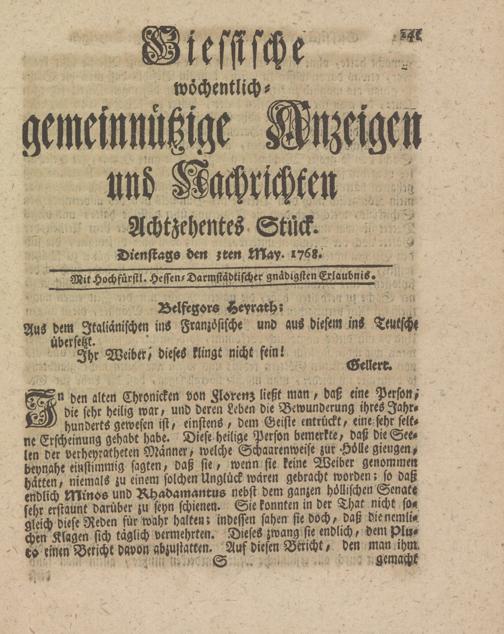 Giessische wöchentliche gemeinnützige Anzeigen und Nachrichten. 1764-1770