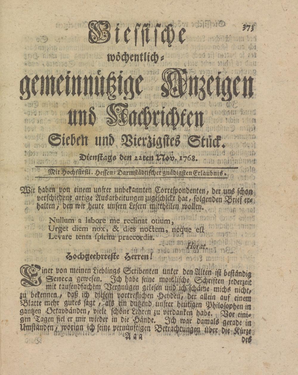 Giessische wöchentliche gemeinnützige Anzeigen und Nachrichten. 1764-1770