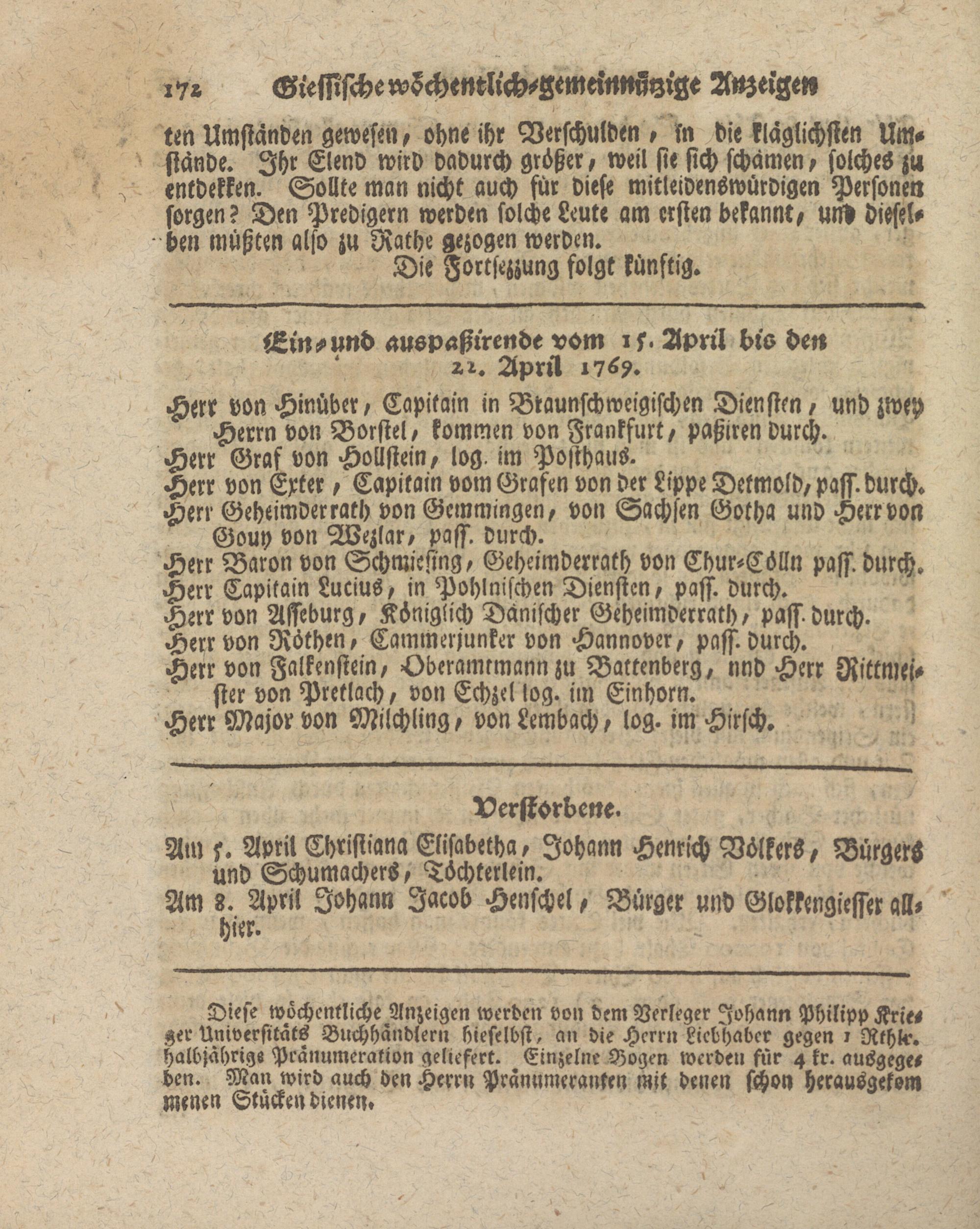 Giessische wöchentliche gemeinnützige Anzeigen und Nachrichten. 1764-1770