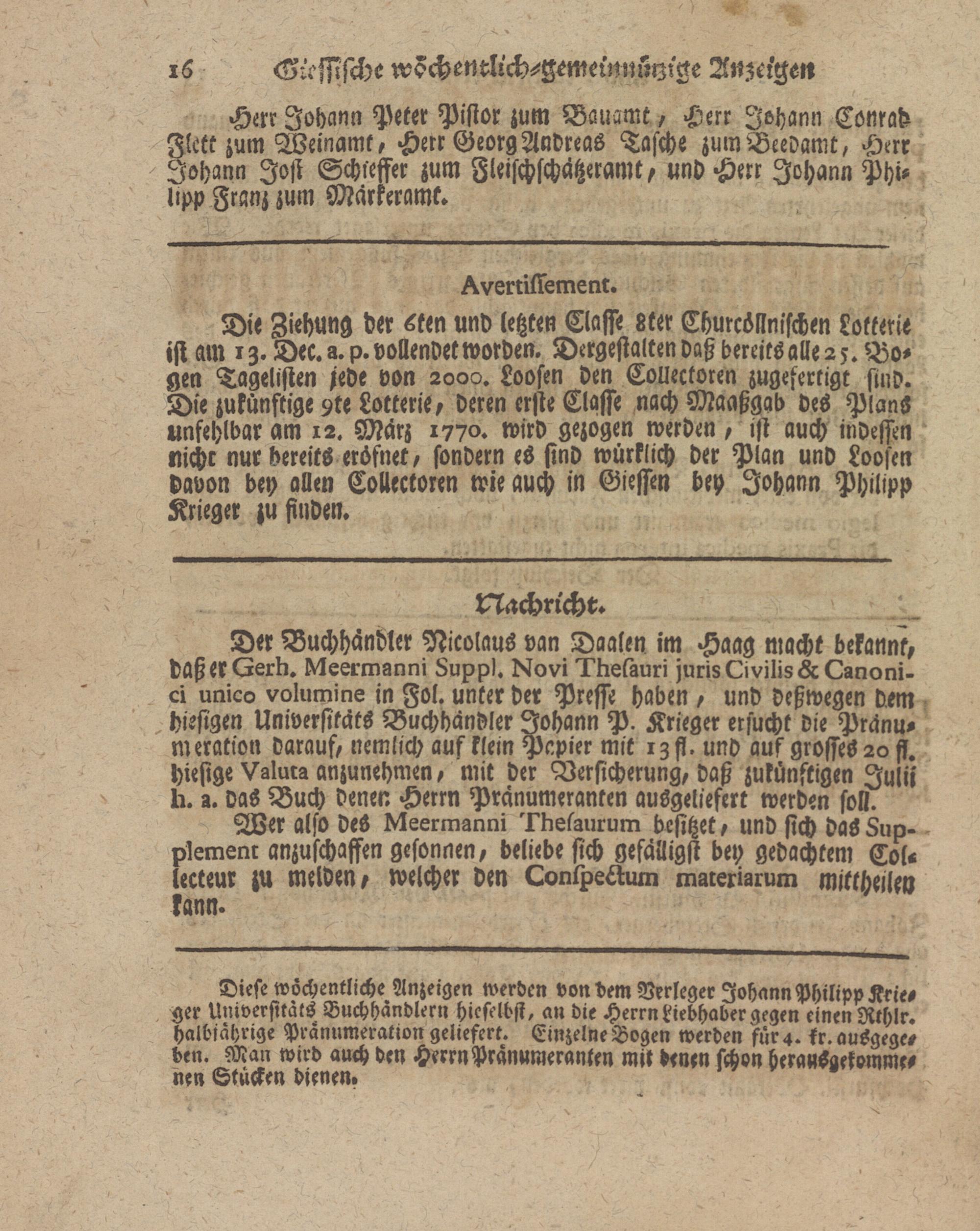 Giessische wöchentliche gemeinnützige Anzeigen und Nachrichten. 1764-1770