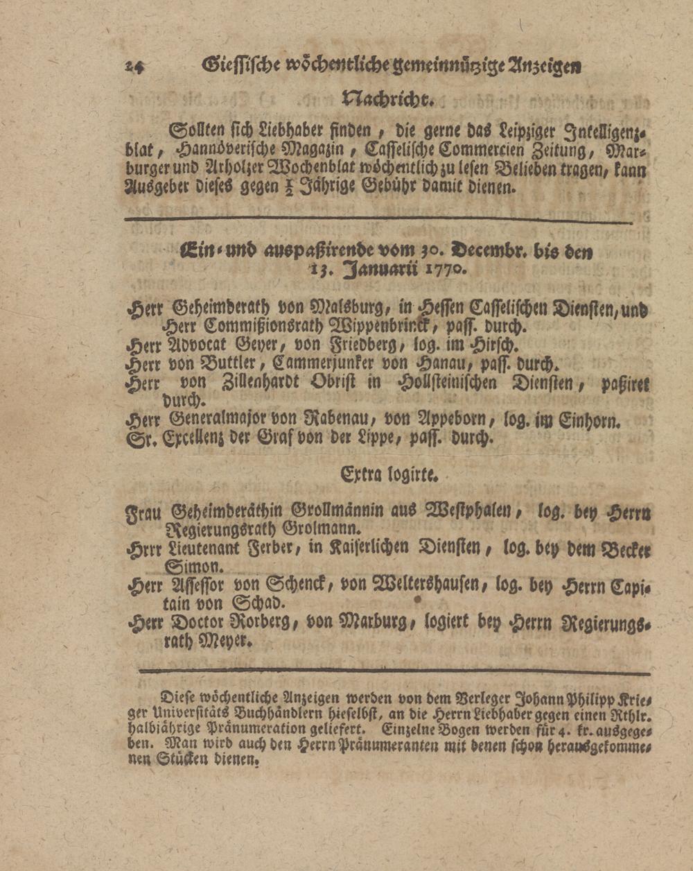Giessische wöchentliche gemeinnützige Anzeigen und Nachrichten. 1764-1770