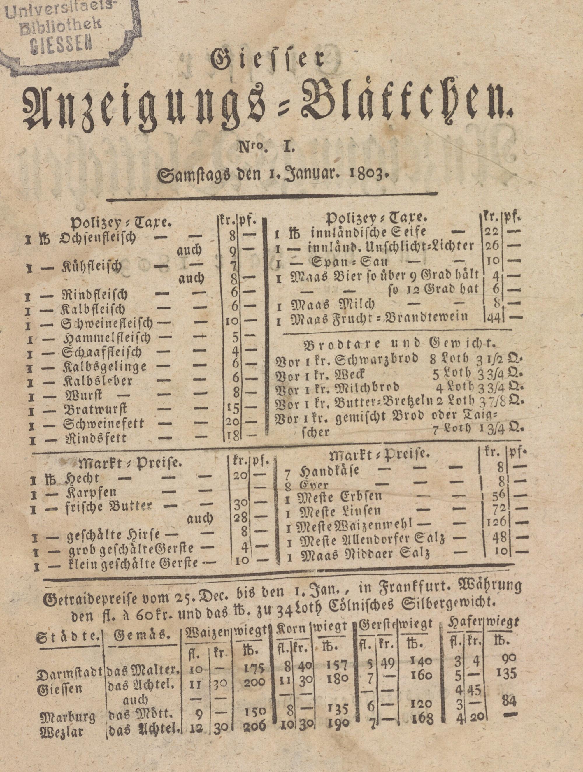 Giesser Anzeigeblatt. 1800-1839